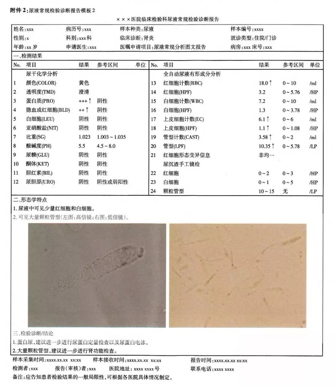 检测图像:一些对诊断有影响的关键检测图像应列出,例如尿液管型和白细胞增多的显微镜照片、红细胞位相图等,提供1~2张典型视野图片,或者一定数量的数字图像分析的形态学图片,作为检验诊断的重要依据。