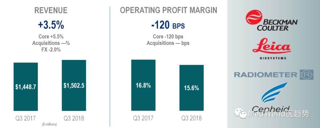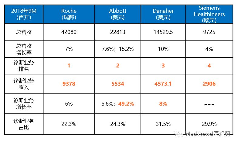 EDTREND 医趋势说 截至今日,随着丹纳赫2018年Q3财报的出炉,IVD Top4在2018年Q3财报全部公布。 2018年Q3, 诊断业务罗氏第一,雅培第二,丹纳赫第三,西门子医疗第四。 相比2017年巨头们对于IVD第二的你争我夺,目前诊断四巨头的营收差距开始拉开。 罗氏:行业第一,且仍保持着较高的业务增速,诊断营收是排名第二的1.7倍。 雅培:收购Alere让雅培仍保持着高达42.6%的增速,预计Alere整年贡献营收将超过20亿美元,让雅培牢牢占据IVD第二。但截至9月底,距离罗氏诊断的营收差额为38亿美元。 丹纳赫:诊断业务增速放缓,上半年11%的增长到了Q3,仅保持在4%。或许需要一场新并购来拉动? 西门子医疗:西门子医疗的诊断业务在排除汇率影响后,Q3增长1%。 ▲IVD Top4 企业2018年Q3数据总览 ▲IVD Top4 企业2018年前9月数据总览