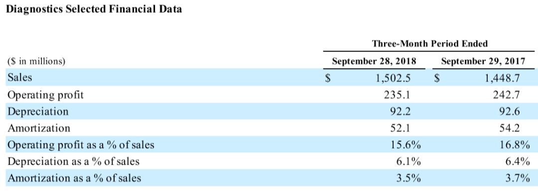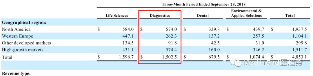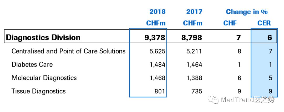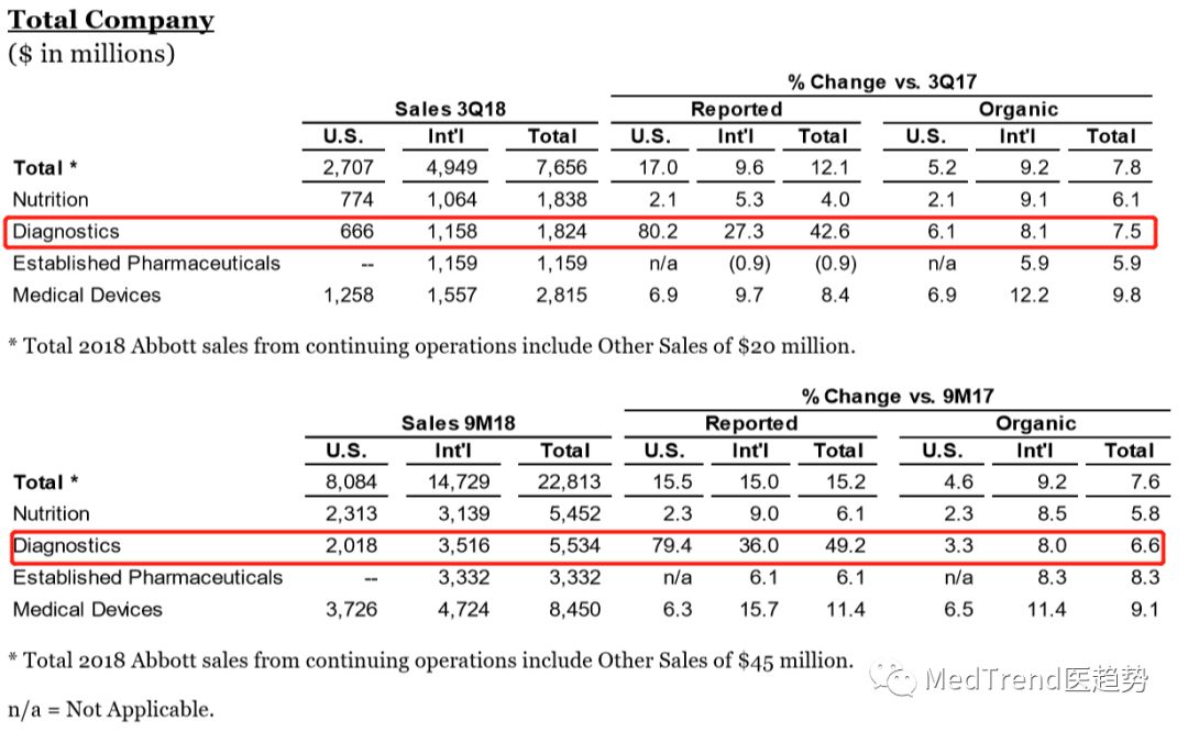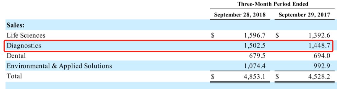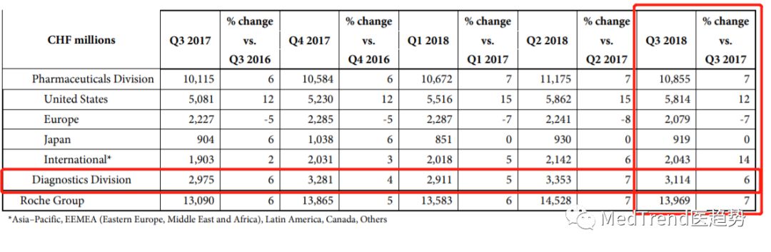 整体营收 罗氏集团2018年Q3营收139.69亿瑞郎,同比+7%。 ▲罗氏 2018年Q3财务数据 诊断业务营收分析 2018年Q3,诊断部门贡献了31.14亿瑞郎的营收,占总营收的22.3%,同比+6%。 由于罗氏未提供2018年Q3诊断业务细分领域的营收详情,因此,下列罗氏诊断细分业务营收分析针对的是2018年1月-9月。 截至9月底,罗氏诊断业务营收93.78亿瑞郎,同比+9%。 ▲罗氏诊断四大业务2018年9M数据 2018年前9个月里, 中心实验室和POC诊断事业部:营收56.25亿瑞郎,同比+7%。主要由免疫诊断(+10%)、临床化学(+5%)驱动。 糖尿病管理业务:营收14.84亿瑞郎,同比+1%。其中,血糖监测(BGM)同比+1%,侵入性检测系统(IDS)继续下滑(-4%)。 分子诊断业务:营收14.68亿瑞郎,同比+5%。其中,cobas® Liat®流感诊断增长高达250%; 人乳头状瘤病毒诊断(HPV)同比+17%;HIV诊断+6%;病毒学领域+4%。 组织诊断业务:营收8.01亿瑞郎,同比+9%。 诊断业务区域营收 ▲罗氏诊断 2018年9M区域营收数据 截至9月底,罗氏诊断在区域上主要由亚太地区(+13%)、拉丁美洲(+8%)、北美(+8%)驱动。 未来发展 未来,罗氏诊断将继续强化在集成的核心实验室(Integrated Core Lab)、综合解决方案、新学科的拓展等方面的发展。 同时,罗氏诊断也在加大对于中国市场的投入。2018年在中国新开设研发生产中心开业,到2021年将拥有400名员工,以确保亚太地区临床化学和免疫检测的持续供应。 ▲罗氏中国新工厂 整体营收 雅培2018年Q3整体营收76.56亿美元,增长+12.1%;排除并购及汇率影响,同比+7.8%。 而2018年前9个月里,雅培集团营收228.13亿美元,增长15.2%;排除并购及汇率影响,同比+7.6%。 ▲雅培2018年Q3及9M整体营收数据 诊断业务营收分析 2018年Q3,雅培全球诊断营收18.24亿美元。2017年10月收购美艾利尔所带来的协同效应加持下,诊断业务增长高达42.6%。排除收购和汇率带来的影响,同比+7.5%。 全球诊断业务营收占集团的23.8%。 ▲雅培诊断2018年Q3及9M整体营收数据 ▲雅培诊断细分业务在诊断营收中的占比 传统诊断:营收10.86亿美元,在诊断营收中占比高达60%,排除收购和外汇影响后,同比+8.1%,涨幅最大。 分子诊断:营收1.21亿美元,在诊断营收中占比7%,同比+6.1%。雅培在分子诊断市场的核心领域——传染病检测领域——的增长引领了全球销售。 Q3,分子诊断业务在美国市场止跌回升(+2.3%),但由于2018年上半年美国市场大跌10.7%,所以截至9月底,美国市场整体同比-6.8%。 床旁诊断(雅培传统POC业务):营收1.36亿美元,在诊断营收中占比7%,增长加速,同比+4.0%。增长主要由i-STAT®手持系统驱动。 美国市场与分子诊断业务境遇相同,不过,如果Q4能继续保持增长,美国市场全年业绩有望呈正增长。 快速诊断(Alere的POC业务):营收4.81亿美元,在诊断营收中占比26%。心脏代谢测试产品的销售增长尤为出色。 截至9月底,快速诊断业务营收达15.24亿美元。 诊断业务区域营收 美国市场:营收6.66亿美元,占诊断营收37%,受收购Alere的影响,增长高达80.2%;排除并购和外汇影响后,同比+6.1%。 国际市场:营收11.58亿美元,增长27.3%,排除并购和外汇影响后,同比+8.1%。 未来发展 雅培对于其Alinity家族系列诊断产品寄予厚望。在财报会议上指出,“Alinity 的全球推出,将使该业务在未来数年内保持高于市场的增速。” 距离完成收购Alere已经过去整整一年,而到2018年年底,这场大型收购有望给雅培带来超过20亿美元的营收,并让雅培牢牢占据IVD第二的位置。 整体营收 ▲丹纳赫2018年Q3数据 2018年Q3,丹纳赫营收48.53亿美元,同比+7%。生命科学业务贡献最高增长+15%、诊断+4%、环境应用+8%,但即将在2019年上半年剥离的牙科业务下滑2%。 丹纳赫Q3净利润为6.637亿美元,同比+15.0%。 诊断业务营收 丹纳赫2018年Q3诊断业务数据 2018年Q3,丹纳赫诊断业务营收15.025亿美元,占总营收的31.0%,同比+4%。受发达市场和高增长市场的强劲增长推动,分子诊断业务、临床实验室业务、急诊护理诊断业务、病理诊断业务四大细分诊断业务均出现增长。