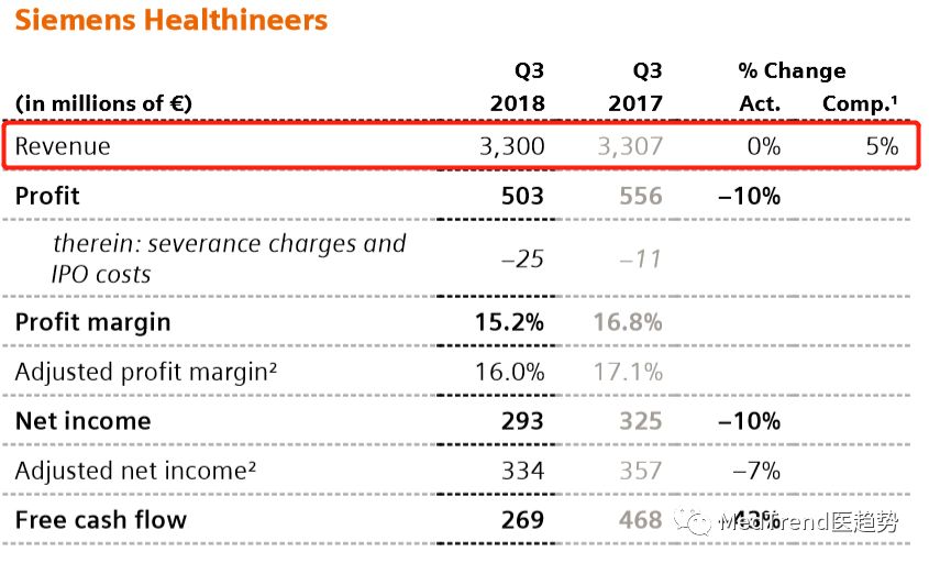区域营收 ▲丹纳赫2018年Q3区域营收 北美:丹纳赫诊断业务第一大市场,贡献5.740亿美元营收,占诊断业务的38.2%; 西欧:营收2.623亿美元,占比17.5%; 其他发展市场:营收0.918亿美元,占比6.1%; 高增长市场(东欧、中东、非洲、拉丁美洲、亚洲,不含日本):营收5.744亿美元,占比38.2%。中国市场持续走强。 未来发展 丹纳赫财报中显示,“公司的增长战略考虑了未来的并购。” 西门子医疗2018年Q3财年区间为2018年4月1日至2018年6月30日。 整体营收 ▲西门子医疗2018Q3营收数据 西门子医疗在 2018年Q3营收33.00亿欧元,排除外汇影响,同比+5%,增长主要由影像业务(+8%)驱动。 诊断业务营收 ▲西门子医疗2018年Q3诊断业务营收数据 2018年Q3,西门子医疗诊断业务持续低迷,营收10.07亿欧元,同比+1%。