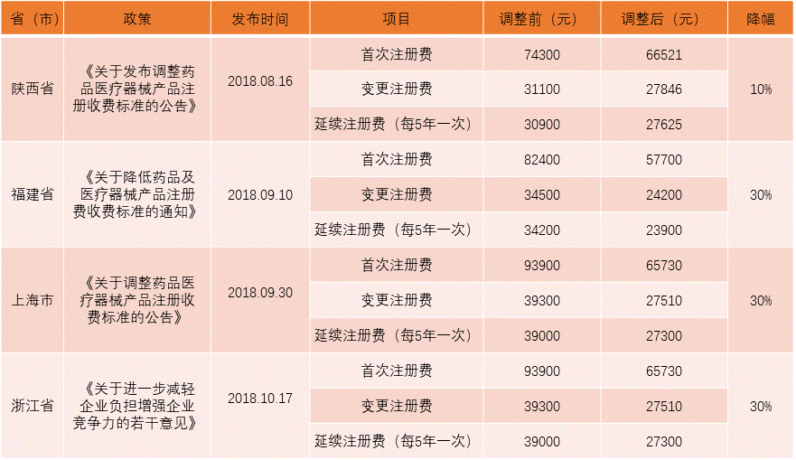 | 在各省(市)发布的第二类医疗器械产品注册费收费标准中,北京、上海、浙江三省(市)曾以首次注册收费93900元,变更注册收费39300元,延续注册收费39000元的最高收费领跑全国。紧追上海市食品药品监督管理局对国产第二类医疗器械注册收费的下调政策,浙江省人民政府办公厅于2018年10月17日印发《关于进一步减轻企业负担增强企业竞争力的若干意见》,意见第四条“停征一批行政事业性收费”中规定“自2018年8月1日起,药品、医疗器械产品注册费在现行基础上下调30%”。截止目前,包括陕西省、福建省在内已有4个省份下调了第二类医疗器械产品注册费收费标准。 |