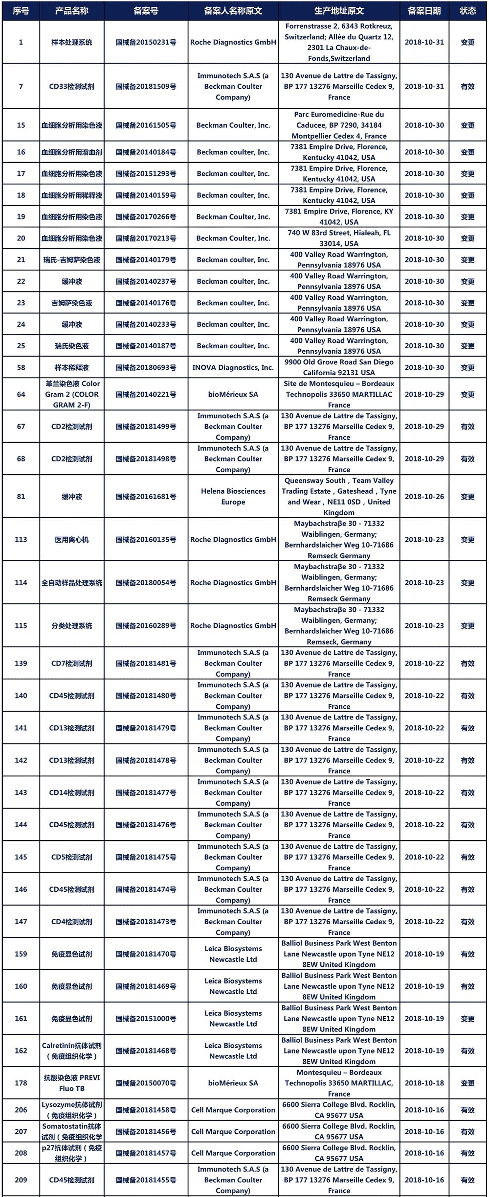 2018年10月进口第一类医疗器械产品备案信息(与体外诊断有关的)