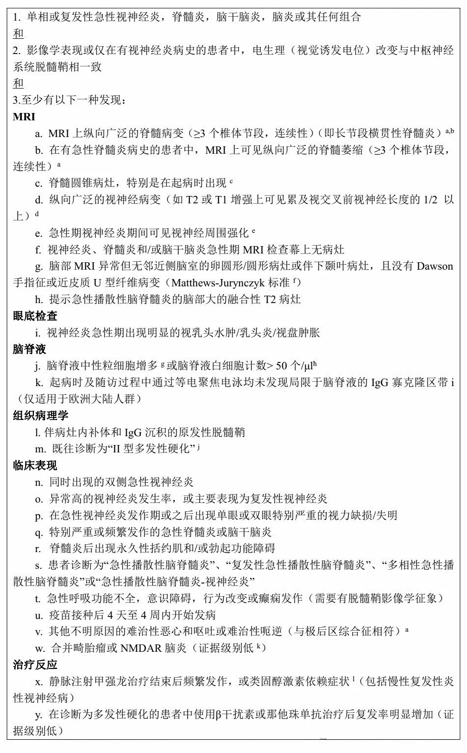 今年5月份,Journal of neuroinflammation杂志发表了有关MOG脑脊髓炎诊断和抗体检测的国际推荐意见,本文首次基于专家共识提出MOG-IgG的检测时机和指征。此外,文中列出了一些被认为是非典型MOG-EM(“警示征象”)的情况,其出现应促使临床医生对MOG-IgG阳性检测结果的正确性提出质疑。最后,对检测方法学、标本取样和数据解释给出推荐。 关于MOG-IgG检测的建议 在表1中,基于典型MOG-EM和/或非典型MS的临床表现和辅助检查结果提出MOG-IgG检测的指征,专家共识小组成员讨论后认为,需要足够高的验前比(pre-test odds,检查前病人患某种疾病的机率)来证实MOG-IgG检测合理性或MOG-IgG检测需求,因阳性结果可能对治疗结果产生重要影响。 这些推荐适用于所有疑似自身免疫因素所致的单相或复发病程的CNS脱髓鞘疾病患者。鉴于验前概率(pre-test probability,即检查前病人患某种疾病的可能性)很低,不建议在疾病进展期进行普通MOG-IgG检测。 表1 考虑自身免疫性急性中枢神经系统脱髓鞘患者的MOG-IgG检测推荐指征 备注:该推荐主要适用于成人和青少年。因MOG-EM在获得性脱髓鞘疾病患儿(可多达70%,发病率随着年龄增长而下降)中明显多于成人(西方国家≤1%;由于MS患病率较低,在日本和其他亚洲国家可能≤5%),因此儿童行MOG-IgG检测的指征不需要像成人那样严格,也降低了概述中提及的抗体筛查风险。(a-l的解释略) 检测选择、标本取样和数据解释相关推荐意见详见表2。 表2 关于方法学、检测参数、标本取样和数据解释的推荐 备注:a 注意这里给出的界值只是一个例子;实际的界值依赖于检测;b 通常静脉注射免疫球蛋白治疗后易导至抗体检测假阴性和假阳性结果;但迄今为止还没有关于目前用于MOG-IgG的任何检测方法是否会受到静脉注射免疫球蛋白治疗影响的研究。 MOG-EM不典型的表现(“警示征象”)见表3,其出现将促使临床医生质疑MOG-IgG阳性检测结果,并积极为患者的临床症状和辅助检查结果寻求更好的解释。 备注:可考虑重新检测,理想情况下使用替代手段,即方法学上不同于CBA的检测方法;如有疑问,可考虑向专业中心寻求专家意见。(a-h的解释略) 临床实践中,许多根据2015年NMOSD国际共识诊断标准诊断的AQP4-IgG阴性NMOSD患者也将满足表1中给出的MOG-IgG检测指征,因此应对其进行相关检测。但MOG-IgG检测不应局限于AQP4-IgG阴性的NMOSD患者。我们建议对所有长节段横贯性脊髓炎患者以及具有MOG脑脊髓炎典型临床和影像学特点和/或非典型多发性硬化表现的疑似中枢神经系统脱髓鞘患者行MOG-IgG检测(参见表1)。 在达成共识的过程中,专家们提出了以下与治疗有关的MOG-IgG检测适应症:①对抗体消除疗法(血浆置换,免疫吸附)反应特别好;②对B细胞耗竭疗法(利妥昔单抗,Ocrelizumab,奥法木单抗)反应特别好,但在B细胞再次出现后立即复发。 尽管专家组的一些成员认为,在经典的多发性硬化中也可观察到对血浆置换,免疫吸附或B细胞耗竭疗法反应良好的。但现已经达成一致意见,除了表1所列出的检测指征之外,如存在对抗体、B细胞耗竭治疗或静脉注射免疫球蛋白反应良好的患者,罹患MOG脑脊髓炎的可能性增加,建议行MOG-IgG检测。 MOG-IgG血清滴度与疾病活动(急性发作期滴度较高)、治疗状态(免疫抑制时滴度较低)以及检测灵敏度等有关,我们建议在急性发作或非治疗间期和/或第2次基于细胞的检测仍为阴性,但基于表1所列内容仍怀疑MOG脑脊髓炎时重新检测MOG-IgG。 研究表明,MOG-IgG滴度中位数在复发期明显高于缓解期,因此定期行MOG-IgG检测可作为预测发作和监测治疗效果的潜在有效方法。但一部分患者在急性发作期滴度仍然相对较低,而另一部分患者在缓解期间滴度却相对较高。目前尚无定期MOG-IgG滴度检测用于复发预测或治疗监控的一般建议。 值得注意的是,有报道部分患者的MOG-IgG抗体随着时间的推移而消失。有趣的是,这些患者大部分为单相病程。初次发作后MOG-IgG消失可能提示预后,因此MOG-IgG阳性患者在首次发作后6-12个月重新检测可能有必要。但仅根据MOG-IgG在第一次发作后是否消失来做出长期治疗的决定具有挑战性。 如果长期的免疫抑制剂或口服类固醇激素治疗在血清转阴后停用,强烈建议密切监测患者的血清MOG-IgG,以确认其阴性的持久性。在下“单相”MOG脑脊髓炎诊断并做出长期治疗决定之前,还应考虑到复发性MOG脑脊髓炎的第1次和第2次发作间隔有很大的个体差异。 MOG脑脊髓炎的诊断标准 MOG脑脊髓炎的诊断标准尚未完善。然而,并没有在所有MOG-IgG阳性患者中发现特异性临床表现或影像学改变(除中枢神经系统脱髓鞘疾病的一般要求外),因此缺乏诊断的必要条件。典型的MOG脑脊髓炎无MRI上的Dawson手指征和卵圆形/圆形病灶,但需进一步研究证实。我们建议目前所有符合以下所有标准的患者均应诊断为MOG脑脊髓炎: 1. 单相或复发性急性视神经炎、脊髓炎、脑干脑炎或脑炎,或这些综合征的任何组合; 2. MRI或电生理(孤立性视神经炎患者的视觉诱发电位)结果与中枢神经系统脱髓鞘相一致; 3. 通过使用人全长MOG作为靶抗原的基于细胞的检测证实血清MOG-IgG阳性。 存在表3中所列内容,被认为具有“警示征象”的患者,如果在方法学不同于基于细胞检测的第2次(必要时第3次)检测中仍未能发现MOG-IgG,应诊断为“可能的MOG脑脊髓炎”,特别是在临床研究和治疗试验的背景下。 局限性和注意事项 由于缺