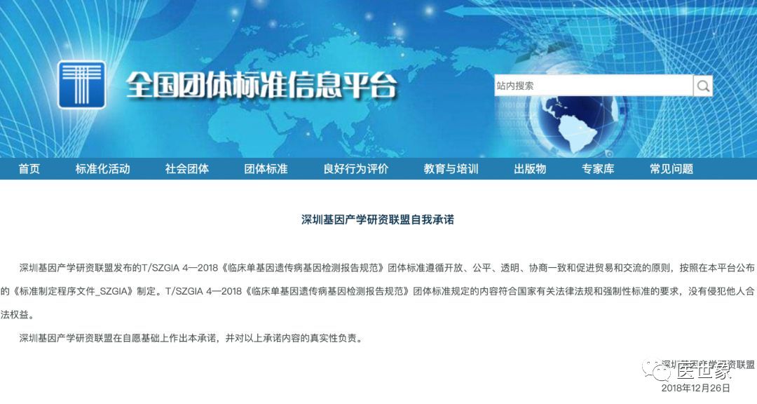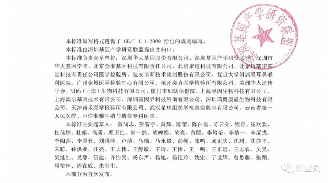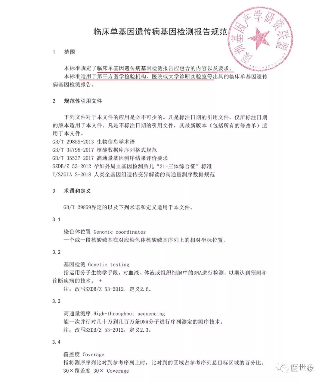 2018年12月26日,深圳基因产学研资联盟发布《临床单基因遗传病基因检测报告规范》团体标准,该标准由深圳华大基因股份有限公司、深圳基因产学研资联盟等21家单位,黄尚志、顾卫红、沈亦平、孙洪业、于世辉、朱宝生等55位基因领域 KOL 联名起草。并于2018年12月27日开始实施。 该标准规定了临床单基因遗传病基因检测报告应包含的内容以及要求,适用于第三方医学检验机构、医院或大学诊断实验室等出具的临床单基因遗传病基因检测报告。 《临床单基因遗传病基因检测报告规范》团体标准的具体内容如下:(点击查看高清图片) |