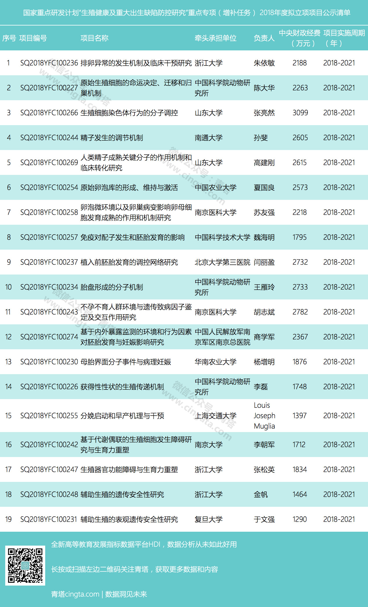 从统计结果来看,中国科学院动物研究所和浙江大学各有3个项目拟立项,总经费分别达到6744万元和5486万元。山东大学和南京医科大学各有2个项目拟入选,总经费分别有5714万元和5000万元。北京大学第三医院、南通大学、中国农业大学、中国人民解放军南京军区南京总医院等高校和科研机构各牵头1个项目。
