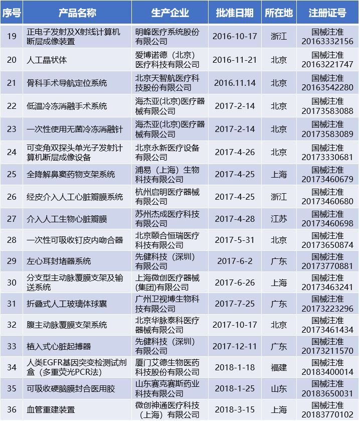 2019年01月11日 发布 近年来,国家药监局贯彻落实《国务院关于改革药品医疗器械审评审批制度的意见》(国发〔2015〕44号)和《中央办公厅国务院办公厅关于深化审评审批制度改革鼓励药品医疗器械创新的意见》(厅字〔2017〕42号),深入推进医疗器械审评审批制度改革,加速医疗器械创新发展。自《创新医疗器械特别审批程序》发布以来,截止2018年12月31日,已有197个产品进入创新医疗器械特别审查通道,批准神经外科手术导航定位系统、正电子发射断层扫描及磁共振成像系统等54个产品注册,一批创新性强、技术含量高、临床需求迫切的创新产品上市,填补了相关领域的空白,更好的满足了人民群众的健康需求。 从批准产品所在地来看,产业大省创新医疗器械数量排名靠前,分别是北京18个、上海10个、广东10个、江苏8个。从批准产品的类型来看,植入类医疗器械22个,诊断类设备9个,体外诊断试剂13个。 国家药监局已批准的创新医疗器械 (共54个产品) (摘自 国家药品监督管理局) |