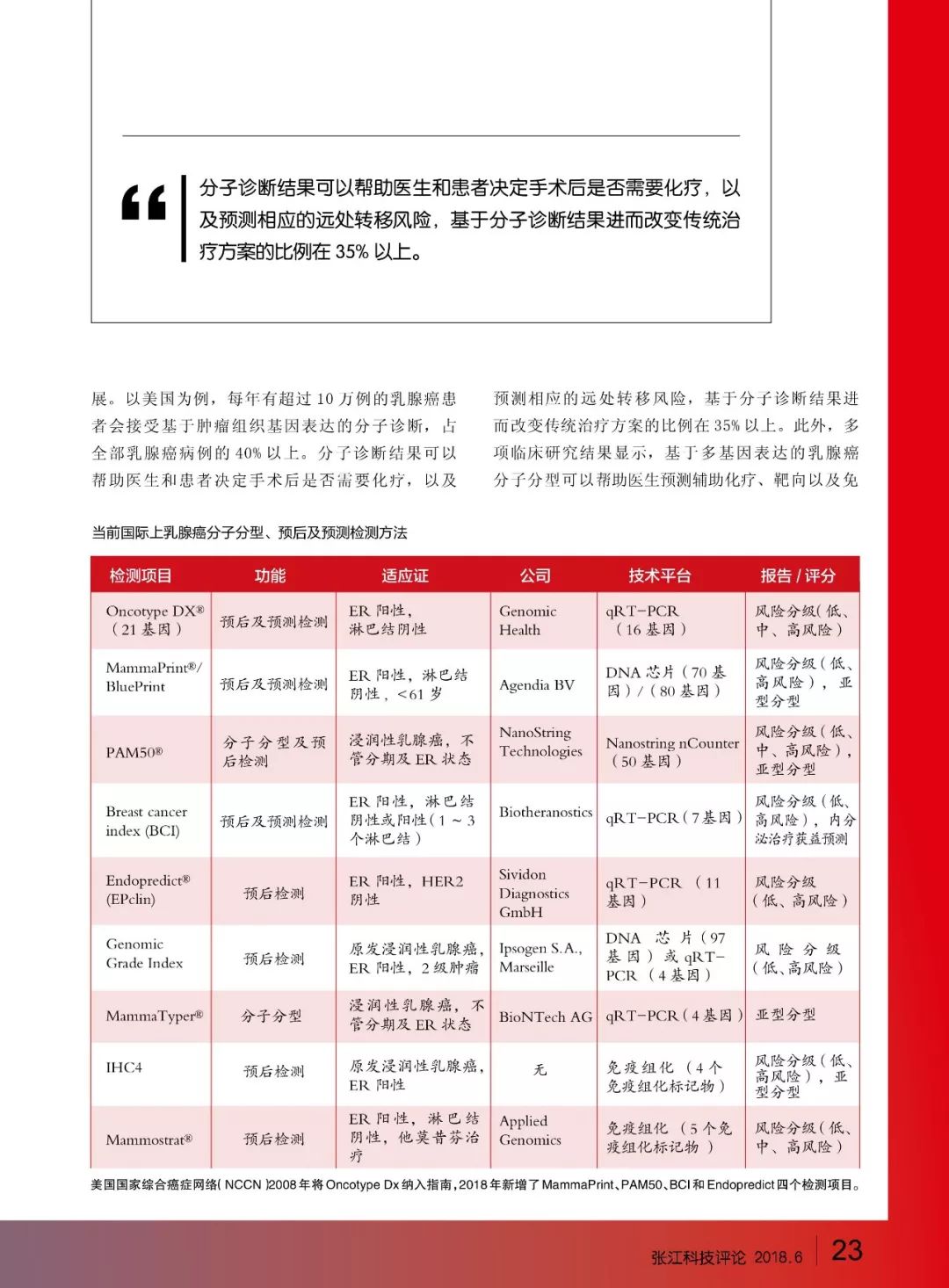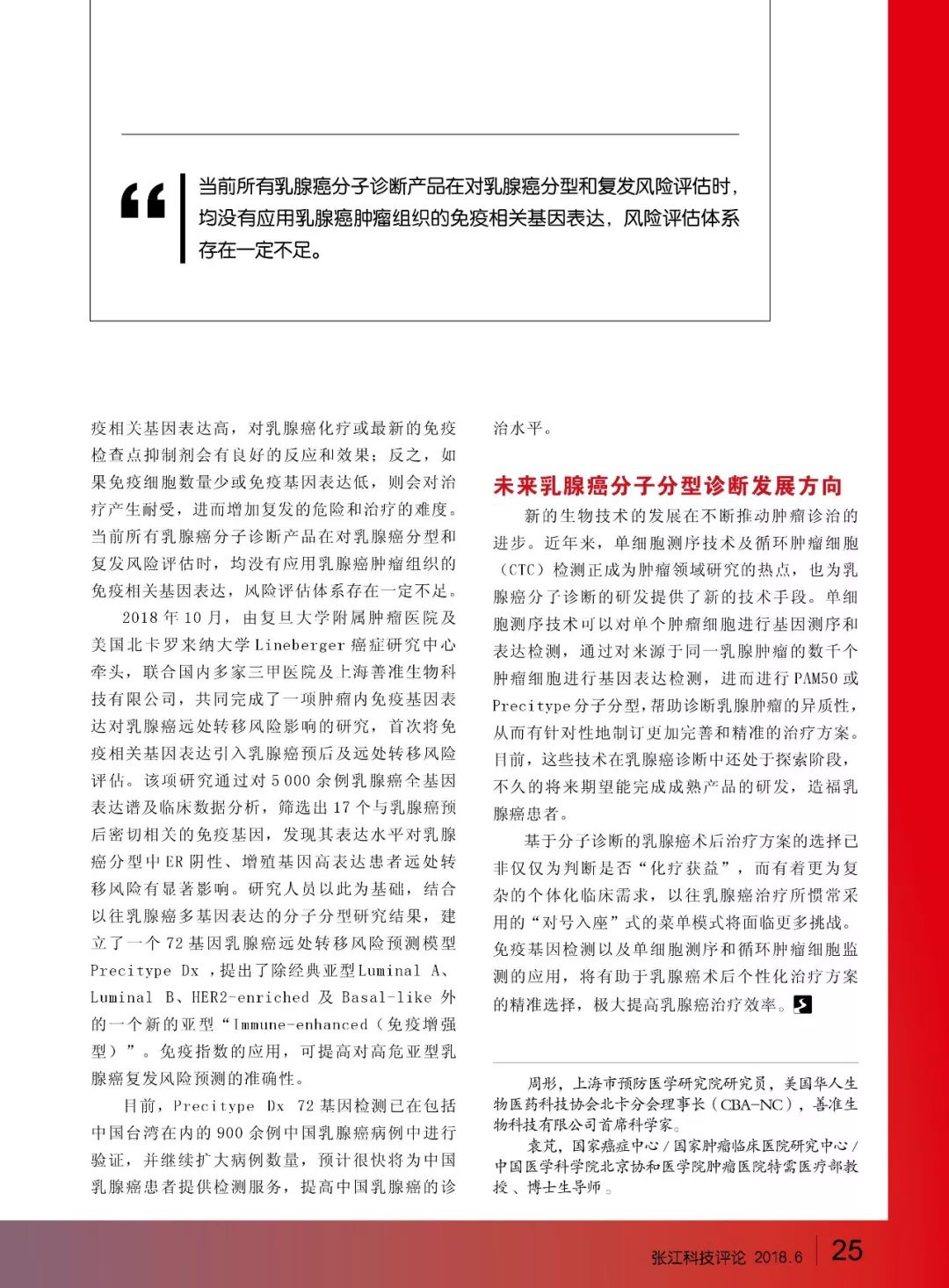 导读:免疫基因检测以及单细胞测序和循环肿瘤细胞监测的应用,将有助于乳腺癌术后个性化治疗方案的精准选择,极大地提高乳腺癌治疗效率。 作者介绍: 周彤,上海市预防医学研究院研究员,美国华人生物医药科技协会北卡分会理事长(CBA-NC),善准生物科技有限公司首席科学家。 袁芃,国家癌症中心/国家肿瘤临床医院研究中心/中国医学科学院北京协和医学院肿瘤医院特需医疗部教授 、博士生导师 。 本篇文章刊发于《张江科技评论》第六期,后续我们会继续连载《张江科技评论》刊发的癌症领域的相关内容,大咖谈癌症,敬请期待! |