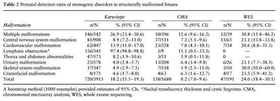 CMA分析 1680例胎儿CMA检测成功,包括396例为多系统异常组、1284例为单系统异常组。在138例发现临床相关CNV,阳性率为8.2%(138/1680)。在这些阳性中,多系统异常组阳性率为12.6%(50/396),单系统异常阳性率为6.9%(88/1284)。22q11.21缺失为最常见的CNV占到12.3%(17/138).随后是1p36.33-p36.22缺失和17q12缺失。 详细结果如下 全外显子分析 196例核型与芯片结果正常的胎儿以及49对父母进行了全外显子测序,值得一提的是,所有接受WES的胎儿病例都与结构异常有关,包括中枢神经系统畸形,心血管系统,骨骼系统,消化系统和泌尿系统以及颅面畸形和多发畸形,但不包括颈部半透明厚度≥3.5mm,囊性水肿和其他超声软标记物。结果见上面的table 2,平均测序深度为102X,99.56%的目标区域大于10X。之前已知用高分辨率芯片对样本进行检测,所以未对WES进行CNV分析。59名胎儿检测到阳性变异,阳性率达到30.1%(59/96)。但是12个变异不能解释临床表型,因为被归类为意外发现,因此能够解释患者表型的致病位点阳性率为24%(47/196)。部分结果如下表 Trio阳性率为26.5%,先证者单人模式阳性率为23.1%,多系统异常的阳性率最高为30.8%,需要注意的是78.9%(75/95)的阳性都是新发突变导至的。