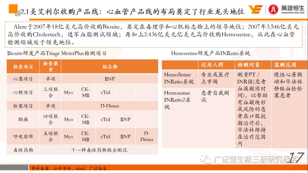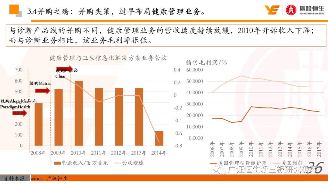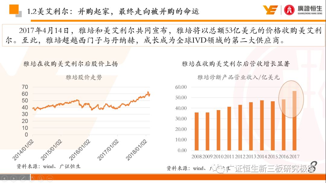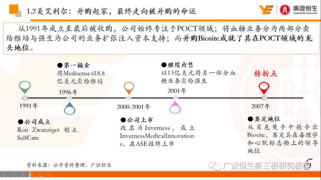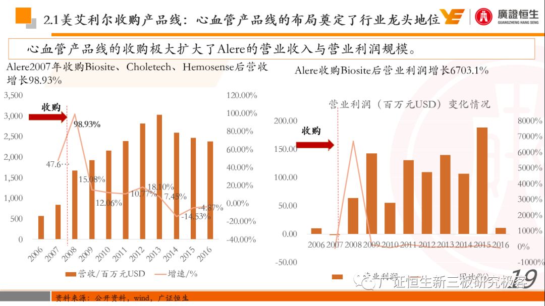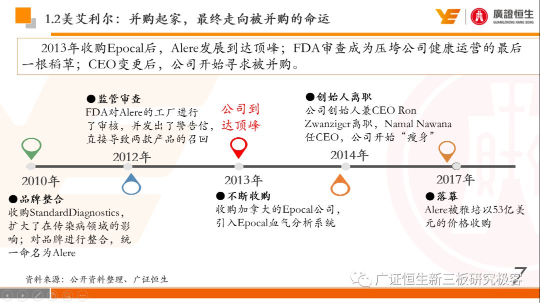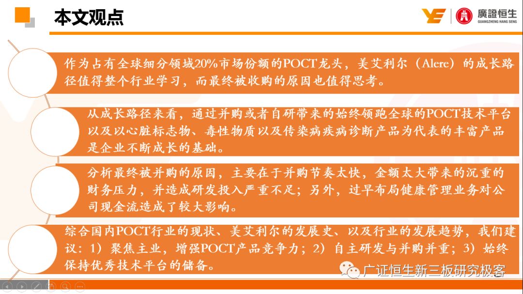 本文观点: 1.作为占有全球细分领域20%市场份额的POCT龙头,美艾利尔(Alere)的成长路径值得整个行业学习,而最终被收购的原因也值得思考。 2.从成长路径来看,并购或者自研带来的始终领跑全球的POCT技术平台以及以心脏标志物、毒性物质以及传染病疾病诊断产品为代表的丰富产品是企业不断成长的基础。 3.分析最终被并购的原因,主要在于并购节奏太快,金额太大带来的沉重的财务压力,并造成研发投入严重不足;另外,过早布局健康管理业务对公司现金流造成了较大影响。 4.综合国内POCT行业的现状、美艾利尔的发展史、以及行业的发展趋势,我们建议:1)聚焦主业,增强POCT产品竞争力;2)自主研发与并购并重;3)始终保持优秀技术平台的储备。 1、美艾利尔发展史:产品的不断丰富造就全球POCT龙头 美艾利尔(Alere)是全球领先的POCT制造商,与罗氏、雅培等处于全球POCT领域的第一梯队,2016年营业收入23.76亿美元,约占全球POCT领域(血糖除外)120亿美元的20%份额。 从1991年成立至最后被收购,公司始终专注于POCT领域;将血糖业务分为两部分卖给雅培与强生为公司的业务扩张注入资本支持;而并购Biosite成就了其在POCT领域的龙头地位。 2013年收购Epocal后,美艾利尔发展到达顶峰;FDA审查成为压垮公司健康运营的最后一根稻草;CEO变更后,公司开始寻求被并购。 2017年4月14日,雅培和美艾利尔共同宣布,雅培将以总额53亿美元的价格收购美艾利尔。至此,雅培超越西门子与丹纳赫,成长成为全球IVD领域的第二大供应商。 2016年美艾利尔前三大产品线占比达到93%,包括传染性疾病诊断、心脏标志物、毒性物质。 美艾利尔产品管线中包括13条自主研发产品线,以及11条并购产品线。由于过重的负债带来的现金流压力以及经营战略安排,自2010年开始美艾利尔经历15次业务剥离。 2、并购是美艾利尔产品线迅速扩张的主要方式 从并购金额来看,美艾利尔主要是并购产品和技术,产比达到68%,其次是健康管理业务,最后是销售渠道。 从并购节奏来看,2007-2013年,通过大量并购迅速扩充产品线。布局健康管理业务是美艾利尔营收增速的分水岭,从此之后营收增速一蹶不振。 美艾利尔于2007年18亿美元高价收购Biosite,奠定在毒理学和心肌标志物上的领导地位;2007年3.546亿美元高价收购Cholestech,进军血脂测试领域;再加上2.436亿美元亿美元高价收购Hemosense,从此在心血管检测领域处于领先地位。 心血管产品线的收购极大扩大了美艾利尔的营业收入与营业利润规模。美艾利尔2007年收购Biosite、Choletech、Hemosense后营收增长98.93%;收购Biosite后营业利润增长6703.1%。 美艾利尔于2007年12月3.095亿美元高价收购Alere Medical、2.34亿美元收购ParadigmHealth,从此进军健康管理业务,并于2008年5月Matria收购了Matria,2009年9月以1.211亿美元收购Free&Clear,从此健康管理领域营收增速下降。 与此相适应的是,美艾利尔总营收和营业利润以2008年收购Matria和2009年收购Free&Clear为拐点,总营收增速和营业利润增速均开始出现大幅度降低,营业利润也由此下降。 美艾利尔于2009年8月以2.114美元收购Concateno,2010年2月以1.095亿美元收购Kroll Laboratory Specialists,2011年10月以1.25亿美元收购Avee,2012年4月以2.95亿美元收购eScreen,布局毒理学业务,从2011年到2012年,毒理学贡献了大约1.999亿美元的增长。 布局毒理学业务虽然不能挽救美艾利尔营收增速、营利增速、以及利润大幅度下降的命运,但是在一定程度上收窄了降幅。 美艾利尔于2010年1.621亿美元收购韩国公司Standard Diagnostics.,扩大了在传染病领域的影响力; 2011年3.888亿美元收购了挪威公司Axis-shield,并将其产品Nycocard和Afinion收归qixia; 2013年收购了加拿大公司Epocal Inc.,引入POCT血液诊断系统产品。 2006-2008年,美艾利尔维生素和营养补充剂业务营收占比从14%降到了5%,而健康管理与信息解决方案业务(ACS业务)在2008-2013年同样发展缓慢。2014年公司开始专注于专业诊断业务,维生素和营养补充剂业务以及ACS业务均在2014年以前剥离。 健康管理业务营收增速缓慢,以及毛利率过低是公司剥离ACS业务的主要原因。 3、美艾利尔最终被并购的原因解析 经过2007年的巨额并购,美艾利尔2008-2013年的营业收入持续增加,在2013年达到最高点。然而相比于营业额的迅速增长与市场占有率的提高,公司的盈利情况一直受到投资者所质疑,2010-2014年持续处于亏损状态,公司终究无法持续扩张,自己也终于走上了被并购之路。 美艾利尔的销售毛利率在2009年以前持续上升,2009年后持续下降,2013年后均低于同行。并购导至自由现金流量不足,2006年-2017年美艾利尔的现金流基本上均低于其他同类企业,公司需不断出售资产以盘活现金流。 资产负债率方面美艾利尔始终远高于丹纳赫,虽然罗氏在2008年-2012年的资产负债率过高,但最终下降,而美艾利尔的资产负债基本呈现连续增加,居高不下。 美艾利尔的并购主要集中在2007年-2012年,速度快,金额大,导至短期内公司每年的利息支出急剧增加。 在公司2007年开始执行激进的并购发展策略以来,虽然公司规模不断增大,每年研发投入的增长却不明显。 2014年以前研发费用均远低于并购费用,2014年后并购费用大幅减少,但是研发投入依旧不足。 过早布局健康管理业务为公司埋下隐患。与诊断产品线的并购不同,健康管理业务的营收速度持续放缓,2010年开始收入下降;而与诊断业务相比,该业务毛利率很低。 美