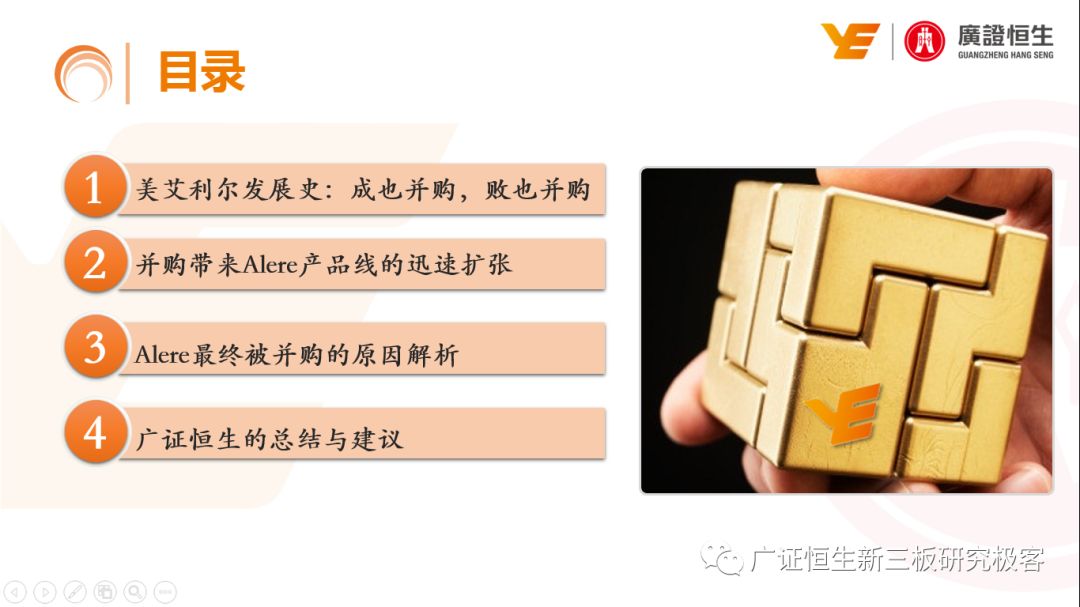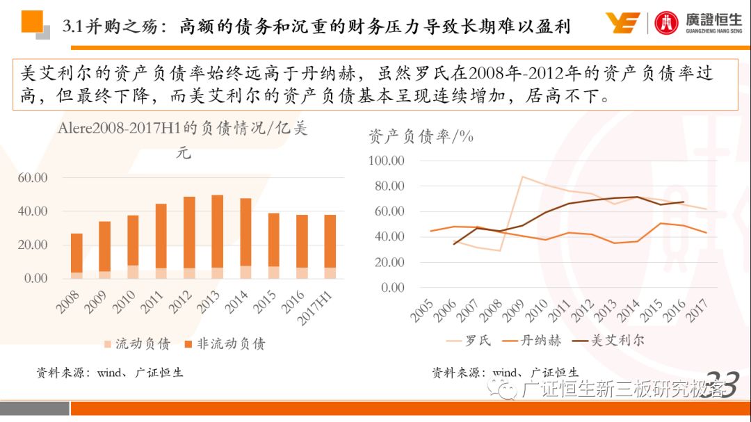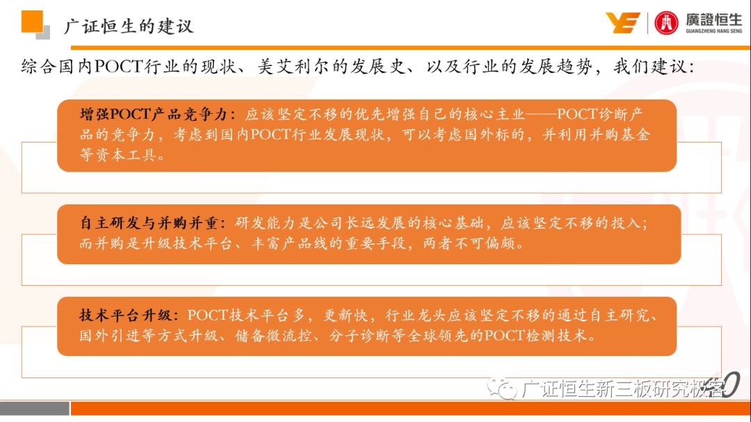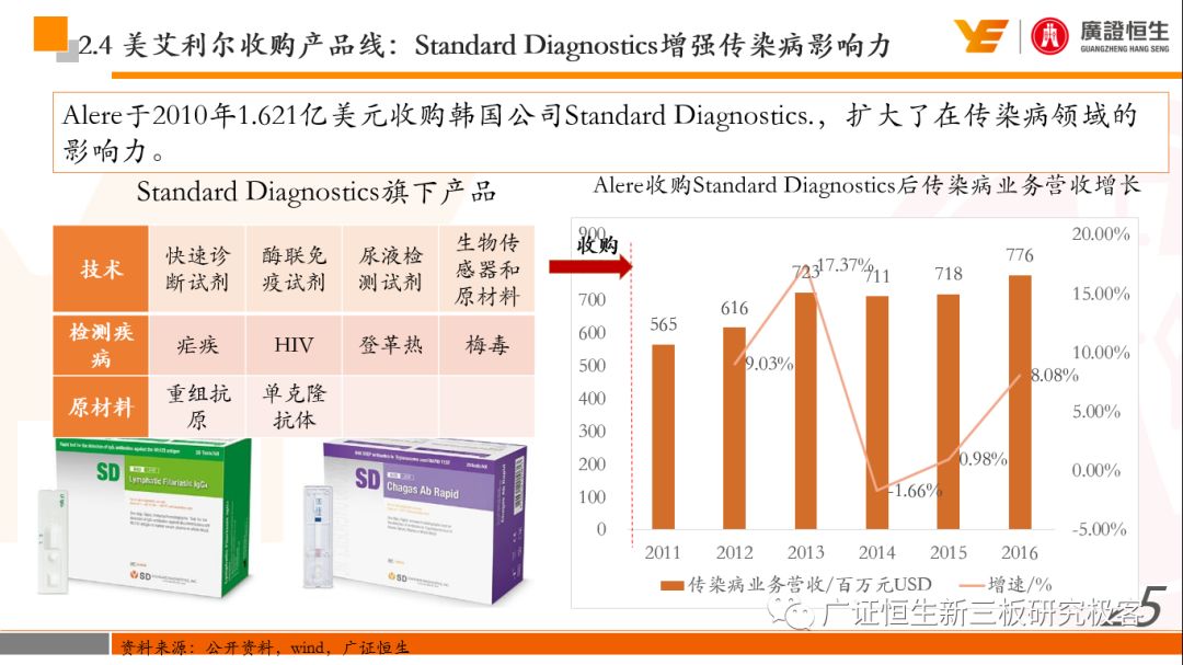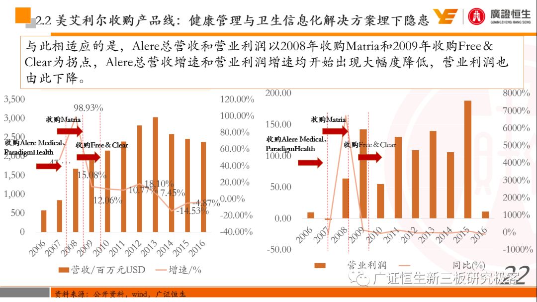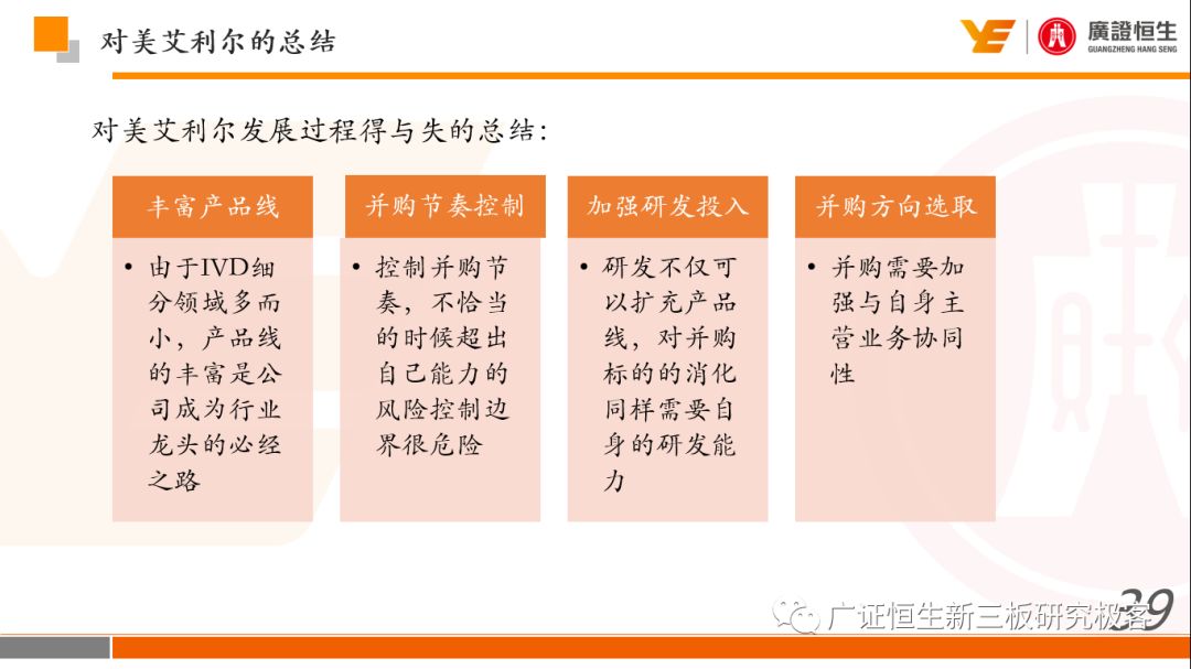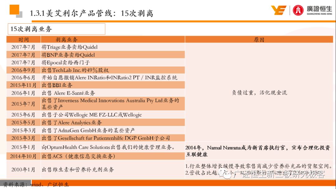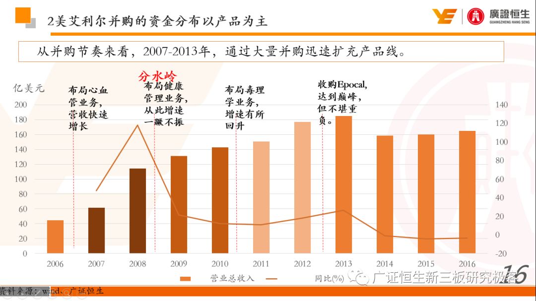 本文观点: 1.作为占有全球细分领域20%市场份额的POCT龙头,美艾利尔(Alere)的成长路径值得整个行业学习,而最终被收购的原因也值得思考。 2.从成长路径来看,并购或者自研带来的始终领跑全球的POCT技术平台以及以心脏标志物、毒性物质以及传染病疾病诊断产品为代表的丰富产品是企业不断成长的基础。 3.分析最终被并购的原因,主要在于并购节奏太快,金额太大带来的沉重的财务压力,并造成研发投入严重不足;另外,过早布局健康管理业务对公司现金流造成了较大影响。 4.综合国内POCT行业的现状、美艾利尔的发展史、以及行业的发展趋势,我们建议:1)聚焦主业,增强POCT产品竞争力;2)自主研发与并购并重;3)始终保持优秀技术平台的储备。 1、美艾利尔发展史:产品的不断丰富造就全球POCT龙头 美艾利尔(Alere)是全球领先的POCT制造商,与罗氏、雅培等处于全球POCT领域的第一梯队,2016年营业收入23.76亿美元,约占全球POCT领域(血糖除外)120亿美元的20%份额。 从1991年成立至最后被收购,公司始终专注于POCT领域;将血糖业务分为两部分卖给雅培与强生为公司的业务扩张注入资本支持;而并购Biosite成就了其在POCT领域的龙头地位。 2013年收购Epocal后,美艾利尔发展到达顶峰;FDA审查成为压垮公司健康运营的最后一根稻草;CEO变更后,公司开始寻求被并购。 2017年4月14日,雅培和美艾利尔共同宣布,雅培将以总额53亿美元的价格收购美艾利尔。至此,雅培超越西门子与丹纳赫,成长成为全球IVD领域的第二大供应商。 2016年美艾利尔前三大产品线占比达到93%,包括传染性疾病诊断、心脏标志物、毒性物质。 美艾利尔产品管线中包括13条自主研发产品线,以及11条并购产品线。由于过重的负债带来的现金流压力以及经营战略安排,自2010年开始美艾利尔经历15次业务剥离。 2、并购是美艾利尔产品线迅速扩张的主要方式 从并购金额来看,美艾利尔主要是并购产品和技术,产比达到68%,其次是健康管理业务,最后是销售渠道。 从并购节奏来看,2007-2013年,通过大量并购迅速扩充产品线。布局健康管理业务是美艾利尔营收增速的分水岭,从此之后营收增速一蹶不振。 美艾利尔于2007年18亿美元高价收购Biosite,奠定在毒理学和心肌标志物上的领导地位;2007年3.546亿美元高价收购Cholestech,进军血脂测试领域;再加上2.436亿美元亿美元高价收购Hemosense,从此在心血管检测领域处于领先地位。 心血管产品线的收购极大扩大了美艾利尔的营业收入与营业利润规模。美艾利尔2007年收购Biosite、Choletech、Hemosense后营收增长98.93%;收购Biosite后营业利润增长6703.1%。 美艾利尔于2007年12月3.095亿美元高价收购Alere Medical、2.34亿美元收购ParadigmHealth,从此进军健康管理业务,并于2008年5月Matria收购了Matria,2009年9月以1.211亿美元收购Free&Clear,从此健康管理领域营收增速下降。 与此相适应的是,美艾利尔总营收和营业利润以2008年收购Matria和2009年收购Free&Clear为拐点,总营收增速和营业利润增速均开始出现大幅度降低,营业利润也由此下降。 美艾利尔于2009年8月以2.114美元收购Concateno,2010年2月以1.095亿美元收购Kroll Laboratory Specialists,2011年10月以1.25亿美元收购Avee,2012年4月以2.95亿美元收购eScreen,布局毒理学业务,从2011年到2012年,毒理学贡献了大约1.999亿美元的增长。 布局毒理学业务虽然不能挽救美艾利尔营收增速、营利增速、以及利润大幅度下降的命运,但是在一定程度上收窄了降幅。 美艾利尔于2010年1.621亿美元收购韩国公司Standard Diagnostics.,扩大了在传染病领域的影响力; 2011年3.888亿美元收购了挪威公司Axis-shield,并将其产品Nycocard和Afinion收归qixia; 2013年收购了加拿大公司Epocal Inc.,引入POCT血液诊断系统产品。 2006-2008年,美艾利尔维生素和营养补充剂业务营收占比从14%降到了5%,而健康管理与信息解决方案业务(ACS业务)在2008-2013年同样发展缓慢。2014年公司开始专注于专业诊断业务,维生素和营养补充剂业务以及ACS业务均在2014年以前剥离。 健康管理业务营收增速缓慢,以及毛利率过低是公司剥离ACS业务的主要原因。 3、美艾利尔最终被并购的原因解析 经过2007年的巨额并购,美艾利尔2008-2013年的营业收入持续增加,在2013年达到最高点。然而相比于营业额的迅速增长与市场占有率的提高,公司的盈利情况一直受到投资者所质疑,2010-2014年持续处于亏损状态,公司终究无法持续扩张,自己也终于走上了被并购之路。 美艾利尔的销售毛利率在2009年以前持续上升,2009年后持续下降,2013年后均低于同行。并购导至自由现金流量不足,2006年-2017年美艾利尔的现金流基本上均低于其他同类企业,公司需不断出售资产以盘活现金流。 资产负债率方面美艾利尔始终远高于丹纳赫,虽然罗氏在2008年-2012年的资产负债率过高,但最终下降,而美艾利尔的资产负债基本呈现连续增加,居高不下。 美艾利尔的并购主要集中在2007年-2012年,速度快,金额大,导至短期内公司每年的利息支出急剧增加。 在公司2007年开始执行激进的并购发展策略以来,虽然公司规模不断增大,每年研发投入的增长却不明显。 2014年以前研发费用均远低于并购费用,2014年后并购费用大幅减少,但是研发投入依旧不足。 过早布局健康管理业务为公司埋下隐患。与诊断产品线的并购不同,健康管理业务的营收速度持续放缓,2010年开始收入下降;而与诊断业务相比,该业务毛利率很低。 美