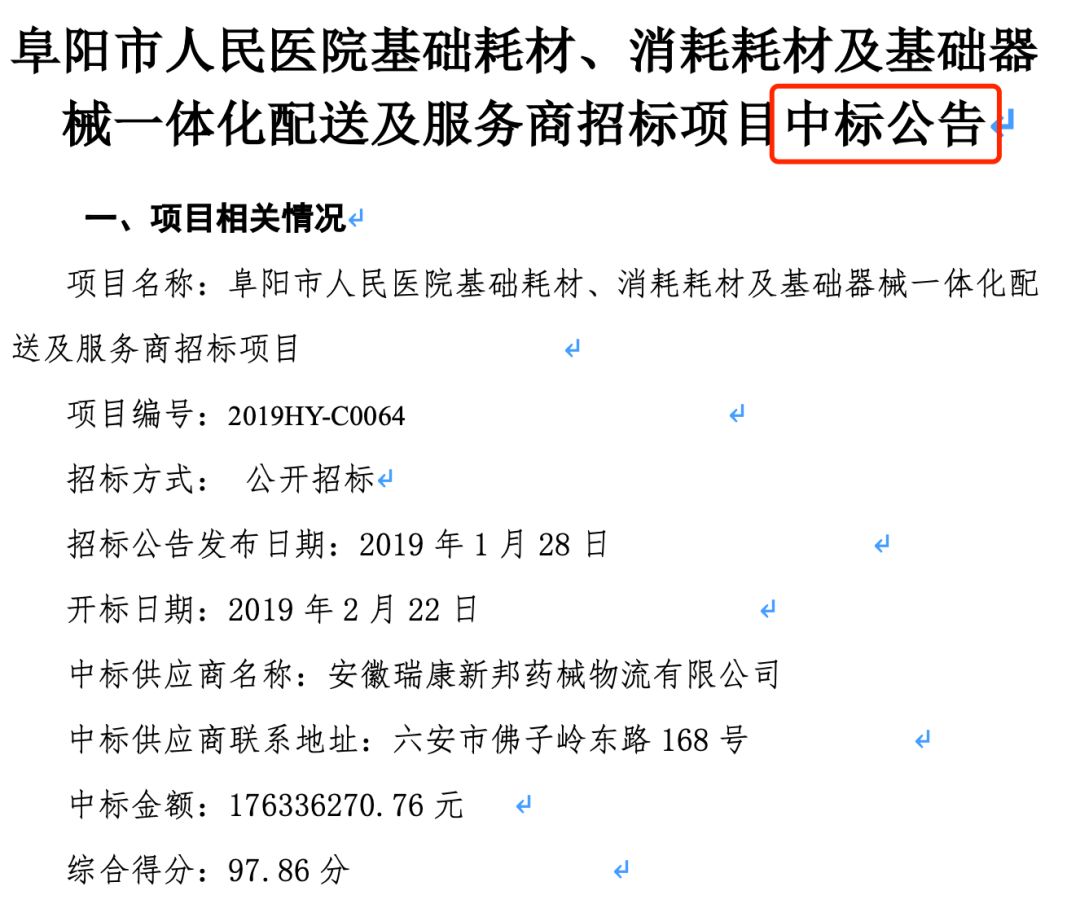 今天(2月22日),中国政府采购网发布《阜阳市人民医院基础耗材、消耗耗材及基础器械一体化配送及服务商招标项目中标公告》(下称《中标公告》),总中标金额约17633万元的耗材等配送及服务项目有了结果。 《中标公告》显示,安徽瑞康新邦药械物流有限公司(以下简称“安徽瑞康新邦”)在招投标评标中综合得分97.86分,成唯一中标企业。 图源:阜阳市人民医院基础耗材、消耗耗材及基础器械一体化配送及服务商招标项目中标公告
