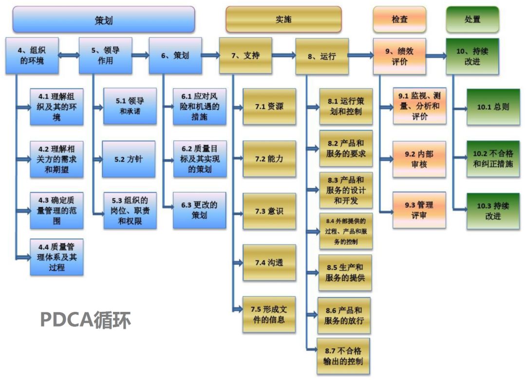 在确定体系范围时,组织还应通过考虑以下因素,确定质量管理体系的边界: ——组织的基础设施; ——组织的不同场所和活动; ——商业政策和战略; ——组织集中控制或由外部提供的职能、活动、过程、产品和服务。 b)可测量; c)考虑适用的要求; d)与产品和服务合格以及增强顾客满意相关; e)予以监视; f)予以沟通; g)适时更新。 实现质量目标时,应确定: a)要做什么; b)需要什么资源; c)由谁负责; d)何时完成; e)如何评价结果。 管理评审输入 策划和实施管理评审时应考虑下列内容: a)以往管理评审所采取措施的情况; b)与质量管理体系相关的内外部因素的变化; c)下列有关质量管理体系绩效和有效性的信息,包括其趋势: 1)顾客满意和有关相关方的反馈; 2)质量目标的实现程度; 3)过程绩效以及产品和服务的合格情况; 4)不合格及纠正措施; 5)监视和测量结果; 6)审核结果; 7)外部供方的绩效。 d)资源的充分性; e)应对风险和机遇所采取措施的有效性(见 6.1); f)改进的机会。 管理评审输出 管理评审的输出应包括与下列事项相关的决定和措施: a)改进的机会; b)质量管理体系所需的变更; c)资源需求。 |
