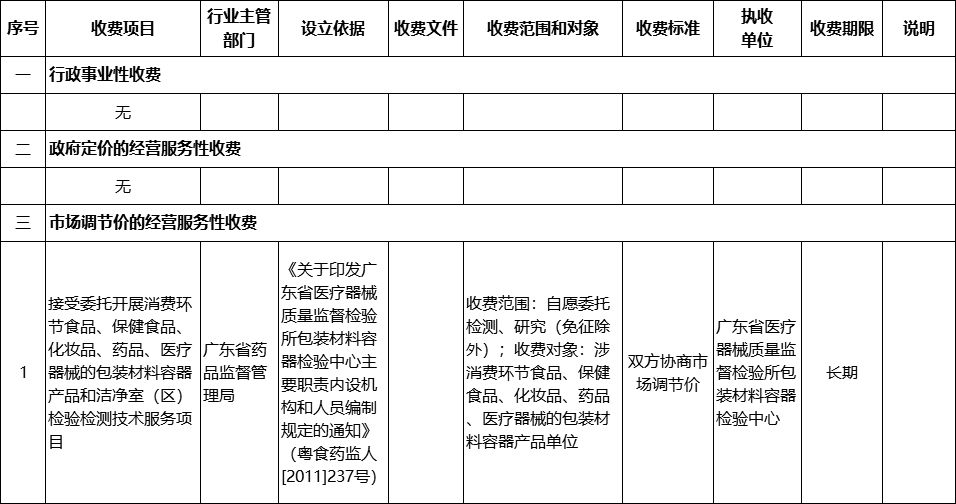2019年3月8日,广东省药监局(局本部和直属事业单位)收费目录清单予以公布。清单中包括境内二类医疗器械注册收费目录清单、医疗器械检验所收费目录清单和包装材料容器检验中心收费目录清单,以下是详细内容: 广东省医疗器械质量监督检验所包装材料容器检验中心收费目录清单