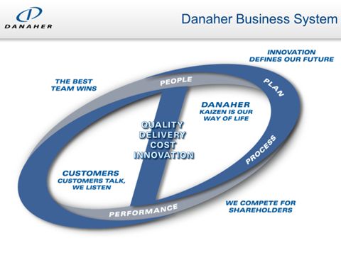 在2018年,整个丹纳赫集团的营业收入当中,有70%属于可重复发生的销售(比如说耗材,维修服务等可以重复发生的营收),只有30%是不可重复发生的销售(比如说卖设备)。 这种独特的业务模式给丹纳赫也带来了不少的好处。 首先,因为可重复的销售占比很高,这就降低了营收的波动性。熟悉华尔街的都知道,什么样的公司最受分析师的欢迎?不断增长的,每季度的财务数据都预测的很准确的公司最受欢迎。 明白了这一点,你就可以理解丹纳赫的股价的增长一直远远高于指数的增长这一现象了。 其次,因为重复销售的占比很高,这就意味着客户的黏性很高。当今这个世界,是得客户者得天下,把客户牢牢的抓在了手里,是核心价值。 第三,一些高门槛的公司的产品利润较高,这就可以给集团带来源源不断的现金流,从而保证丹纳赫公司不停的买买买。 并购之王增长的利器:DBS 在2018年的投资者大会上,丹纳赫的CEO Tom Joyce在他的PPT上的第一句话就是,今年优异的成绩是由DBS驱动的。 丹纳赫是一个言必称DBS的公司,以至于一些人认为DBS在丹纳赫的地位,就相当于毛泽东思想邓小平理论在中国的地位一样。 那个这个DBS究竟是什么呢?DBS是“丹纳赫业务系统”(Danaher Business System)的简称,这是丹纳赫集团从丰田的精益生产管理系统中学习、借鉴并发展出来的一套丹纳赫自己的管理体系。 ▲丹纳赫业务系统(Danaher Business System) DBS脱胎于丰田的精益生产系统,但现在的名气恐怕已经超过了丰田的TPS (TOYOTA Production Systems),目前似乎唯一能够跟DBS比肩的管理体系恐怕只有兴起于摩托罗拉,兴盛于GE的六西格玛了。 在丹纳赫内部,DBS被称为公司的“圣经”,从上到下,所有业务,所有的管理活动都需要以DBS为指导原则。 Tom Joyce在投资人大会上是这么评价DBS的作用的:“DBS是我们独特的竞争优势,我们就是DBS,DSB就是我们的行为准则和奋斗目标”(DBS is our competitive advantage: it’s who we are, and how we dowhat we do)。 DBS到底起到了那些具体作用呢?让我们来看看丹纳赫CEO口中DBS的辉煌“战绩”吧: