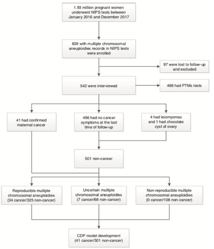 图4:癌症诊断算法CDP流程图,来自文献[1] 3. 这项研究的主要方法(方法学) 【样本】2016年1月至2017年12月期间193万名接受NIPS的孕妇的记录,在初始NIPS测试中检测出多个染色体非整倍体阳性的639名孕妇。发现的41例孕期肿瘤病人来自于中国等亚洲地区和欧洲地区。