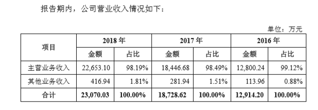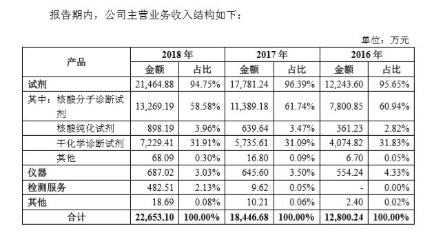 报告期内,硕世生物主营业务收入分别为12800.24万元、18446.68万元、22653.10万元,占比分别为99.12%、98.49%、98.19%,其他业务收入来源于原材料销售。主营业务为体外诊断试剂、配套检测仪器以及检测服务,其中试剂销售收入为主要来源。