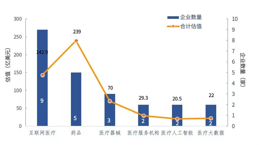 通常医疗健康领域获得风险投资或私募投资、估值超过10亿美元,且成立时间不超过10年的创业企业称之为“独角兽”,他们具有稀缺珍贵、发展速度快、投资者竞相追求等属性。 一、医疗健康独角兽企业发展现状 统计结果显示,全国医疗健康产业现有“独角兽”企业23 家,估值总和近550 亿美元,分布于药物研发、互联网医疗、医疗服务、医学影像、体外诊断、医疗人工智能、医疗大数据等生物医药产业中的重点细分行业,成为“独角兽”企业经历的时间平均为55 个月。 1. 企业估值呈金字塔分布。医疗健康“独角兽”企业总体估值已经达到500 亿美元级别,其中>100 亿美元以上 “超级独角兽”1家,为复宏汉霖;50~100 亿美元有2家,分别为微医集团和联影医疗;10~<50亿美元有20家(占86.96%),合计估值为235 亿美元,占总体估值的43.9%。见图1。 图1 全国医疗健康独角兽企业估值分布情况 数据来源:火石创造 2. 企业成立时间在2014—2018年期间。2014—2018年成立的企业有11家,占47.83%;其中2016年和2018年成立的有2家,分别为天境生物和腾盛博药,均为生物药研发企业。见图2。 图2 医疗健康独角兽企业成立年份分布情况 数据来源:火石创造 3. 企业融资以B轮及以后阶段为主。23家医疗健康“独角兽”企业中,企业融资阶段主要在B轮及以后为主,其中A轮2家,占8%;B轮8家,占35%;C轮3家,占13%;D轮5家,占22%;E轮及以后、战略融资完成后5家,占22%。见图3。 图3 医疗健康“独角兽”企业融资阶段分布 数据来源:火石创造 4. 上海、北京是医疗健康“独角兽“企业主要孵化地。23家医疗健康“独角兽”企业分布在7个省(市、自治区),主要栖息在上海(9家)和北京(5家),共占61%;其中上海市医疗健康“独角兽”企业估值合计320.3 亿美元,占总估值的59.9%。见图4。 图4 医疗健康“独角兽”企业地域分布 数据来源:火石创造 5. 50%以上的医疗健康独角兽企业分布在互联网医疗和药品行业。23家医疗健康“独角兽”企业分布在6个子行业,互联网医疗9家(占39.13%),合计估值142.9亿美元,其中微医集团估值领先。药品领域5家(占21.74%),合计估值239 亿美元,其中复宏汉霖的估值领先。医疗器械领域3家,合计估值70 亿美元,其中联影医疗的估值领先。其余领域各2家,合计估值在20.5~29.3亿美元。见图5。 图5 医疗健康“独角兽”企业所处领域分布 数据来源:火石创造 二、 医疗健康独角兽企业发展面临的机遇 1. 社会环境因素带来市场扩容的机遇。我国≥65岁老年人约有3亿人,占总人口的22%,人口老龄化问题日益严重,心血管疾病、糖尿病、肿瘤等慢病高发,对医疗、医药资源的需求增加,另外,慢病呈现年轻化趋势,我国生物医药产业市场规模不断扩大,生物医药市场潜力巨大。 2. 经济环境变化带来新的发展良机。我国经济环境正从高速增长、规模速度型粗放增长、产业结构中低端化、靠要素和投资驱动产业增长逐渐向中高速增长、质量效率型集约增长、产业结构中高端化和靠创新驱动产业增长等方向转变。生物医药产业作为技术主导型、创新驱动型战略性新兴产业,在我国经济新旧动能转换的关键阶段,将迎来新的发展良机。 3. 资本市场政策红利带来融资便利的机遇。为了欢迎生物科技“独角兽”登陆,资本市场出台了各种便利性政策,为生物医药“独角兽”企业上市融资提供便利的通道。 港股上市新规对于生物科技领域的企业有所倾斜,允许尚未盈利的生物科技公司赴港上市;A股对生物科技、云计算、人工智能、高端制造等四大行业中的独角兽企业招股书审批时间和盈利情况都有所放宽;科创板注册制实行,吸引大量生物科技创新型企业上市融资。 4. 新药研发环境改善带来药品上市加速的机遇。国家政策和财政投入在我国创新药物研发中起着决定性的作用,影响到我国创新药研发的政策包括:产业政策、科技政策、注册监管政策、医保支付政策、财税金融政策和采购政策等。 近年来各个环节的政策正迅速改善,鼓励药械创新研发、优先审评审批、仿制药一致性评价等政策的出台,为新药研发提供了良好的产业发展环境,也将为国内新药研发进程加速和重大临床急需的进口药品引入的加速带来机遇。 5. 生物技术的进步带来疾病治疗方式颠覆性变化的机遇。生物技术的发展日新月异,包括基因测序、干细胞、基因编辑、 液体活检和细胞免疫治疗等技术日益成熟,为将来攻克治愈严重影响人类健康生存的疾病(包括神经退行性疾病、糖尿病和肿瘤)带来希望,进而产生巨大的市场需求。 6. 大数据、互联网和人工智能与医疗结合带来新业态机遇。随着人工智能(AI)、大数据、云计算等新兴技术应用的不断涌现,与医疗健康的结合应用也在逐渐落地,这给生物医药产业痛点的解决提供了新的解决方案,将极大的提高医疗效率,推动医疗健康产业的供给侧改革,加速医药医疗产业创新进程。 三、医疗健康独角兽企业发展将面对的挑战 1. 独角兽新型业务缺乏上下游产业链配套。“独角兽”企业在临新产业、新业态环境下领跑时, 后方资源却跟不上。如近年在我国开始起步的第三方影像行业,面临设计装修布局、合格医生培训体系、专业运营管理、市场开发配套和云服务平台网络服务等方面滞后的困境。 2. 独角兽业务的开拓和规模扩张需要大量资金。医疗健康“独角兽”企业属于资本密集型和技术密集型企业,在快