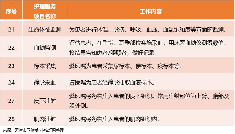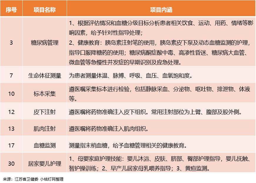 从各地公布的护理项目来看,其服务项目涉及的范围大致相同,生命体征监测、血糖检测、标本采集、皮下注射和肌肉注射等均在列。另外,江苏还明确了“负面清单”,禁止涉及含有精神药品、医疗毒性药品、放射性药品等特殊管理药品和有创操作技术项目等。