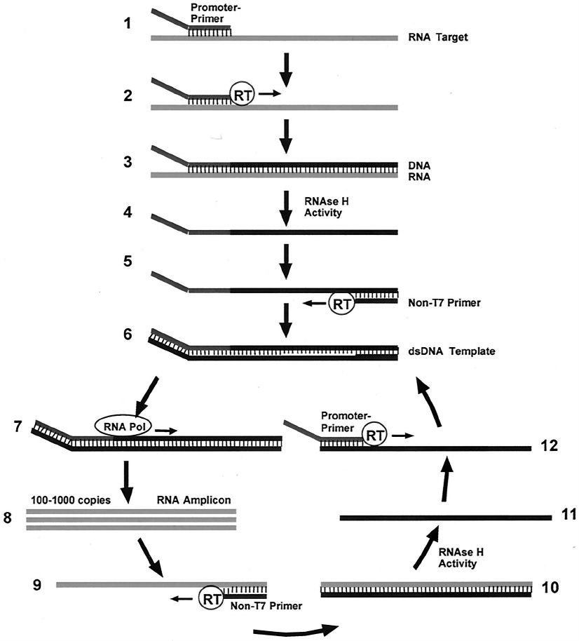 当标本细胞溶解后,目的mRNA被释放出来并由带有磁性微粒的低聚物捕获。转录介导等温核酸扩增是针对靶序列设计一对特异性引物,其中启动子引物(Promoter primer)上具有 T7 RNA聚合酶识别的启动子序列,这一引物与靶序列结合后,在反转录酶的作用下进行反转录反应,形成 RNA/DNA杂交分子。反转录酶所具有的RNase H活性可以水解 RNA/DNA杂交分子,形成单链NDA,该单链 DNA含有T7 RNA聚合酶识别的启动子序列。然后引物 2与单链DNA结合,通过反转录合成双链DNA。T7 RNA聚合酶结合在启动子上,以DNA为模板进行转录,由一分子DNA模板可得到100-1000拷贝转录本,这些转录本又进入反应,作为转录介导等温核酸扩增的起始模板,重复上述步骤。反应完成后,可用杂交保护试验 (hybridization protection assay: HPA) 对RNA产物进行检测。