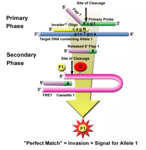 简单来讲,该法采用Invader寡核苷酸和寡核苷酸探针与靶向HPV DNA序列结合,由于设计了一个重叠序列,因此这时候这两个探针与靶向HPV DNA序列形成了一个侵袭性结构。此时,裂解酶会在重复序列裂解产生许多5端片段,并进一步与通用的发夹荧光共振能量转移器(FRET) 寡核苷酸结合,形成另一个侵袭性结构。在裂解酶的作用下,荧光分子被释放,猝灭的荧光信号恢复。通过荧光信号的强弱就能判断靶向HPV DNA序列的有无。