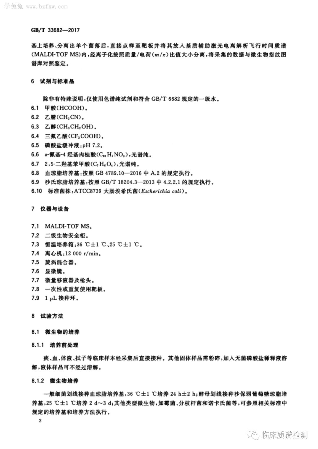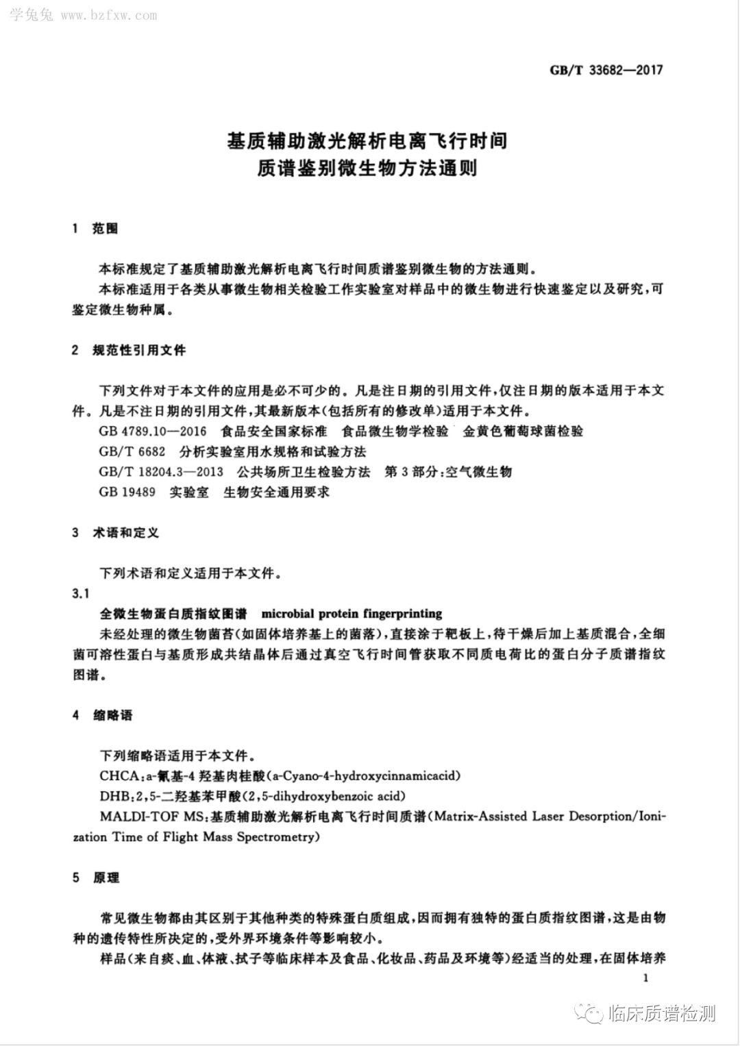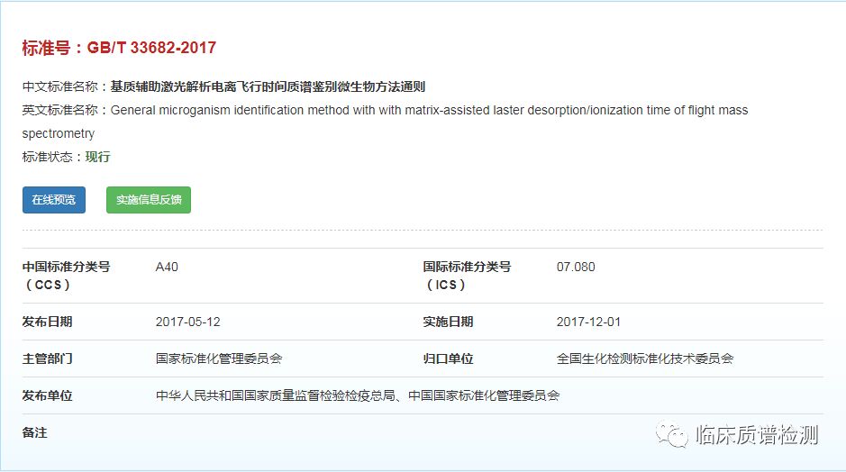 Hello,大家好,前面的文章我们有发过微生物MALDI-TOF-MS鉴定的简介和四篇专家指南共识,错过的小伙伴可以在文末相关推荐处查看。今天给大家带来的是一篇2017年12月份开始实行的推荐性国标《GB/T 33682-2017 基质辅助激光解析电离飞行时间质谱鉴别微生物方法通则》。 点击图片放大查看