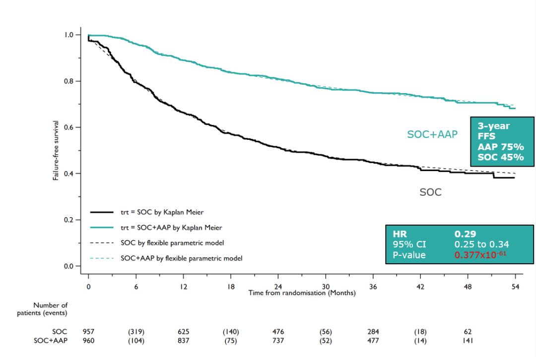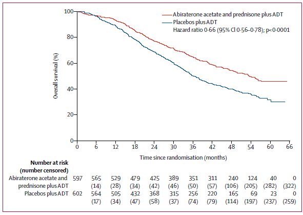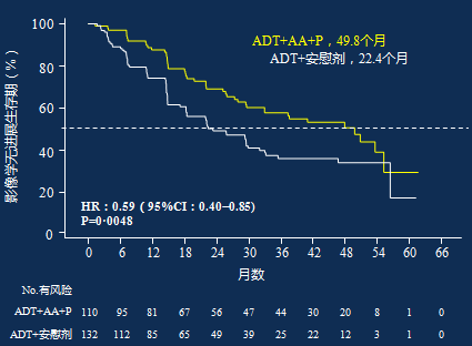阿比特龙新适应症于2018年11月在中国获批,用于治疗新诊断高危转移性激素敏感性前列腺癌,自此中国患者进入了新型内分泌治疗方案时代。 2018年,中国前列腺癌(PC)治疗领域有两部重磅专家共识发布更新,分别为中国抗癌协会(CACA)发布的《2018版转移性前列腺癌诊治中国专家共识》及中国医促会发布的《前列腺癌新型内分泌治疗安全共识》。两部共识此次更新最大的亮点在于将阿比特龙作为转移性激素敏感性前列腺癌(mHSPC)的一线治疗推荐。 共识变更亮点: 阿比特龙使mHSPC患者显著获益 我们先来看看CACA泌尿男生殖系统肿瘤专业委员会的《2018版转移性前列腺癌诊治中国专家共识》。这部共识在正文开头第一段的显著位置就明确指出:近年来研究结果显示,具有高危因素的mHSPC患者加用阿比特龙和多西他赛治疗,其总生存(OS)时间能获得更明显的受益。 在CACA共识的mHSPC药物治疗部分,第一条推荐就是关于阿比特龙的:对于mHSPC患者,推荐雄激素剥夺治疗(ADT)联合阿比特龙1000mg(1次/d)联合泼尼松5mg(1次/d)治疗(证据级别1)。另外,对于低转移负荷患者,推荐ADT联合阿比特龙1000 mg(1次/d)联合泼尼松5mg(1次/d)治疗,或单纯ADT,或ADT联合抗雄激素类药物(CAB)治疗(证据级别3)(图1)。 图1 mHSPC的分类及治疗策略 医促会的《前列腺癌新型内分泌治疗安全共识》则指出,尽管如今针对mHSPC的治疗方案和新型治疗药物层出不穷,其标准治疗方案依然是3种:ADT、ADT联合多西他赛以及ADT联合阿比特龙。其中,阿比特龙是截至目前唯一在国内获批用于晚期PC患者的新型内分泌药物。作为mHSPC尤其是高肿瘤负荷mHSPC患者的标准联合治疗方案,其临床试验和真实世界的临床疗效与安全性都具一定优势。 专家共识推荐:针对mHSPC患者,尤其是高危患者(Gleason评分8~10,3处以上骨转移病灶或内脏转移等3项危险因素至少满足2项者),ADT联合阿比特龙应作为标准一线治疗方案。推荐剂量为1000mg口服,1次/d,与泼尼松5mg口服1次/d联用(表1)。 表1 阿比特龙治疗mHSPC的用药情境模式 注:推荐依据来源于III期随机对照临床试验 推动共识变更的两项大型临床研究 用药推荐的变更是基于大型循证研究结果之上的,近年来多项大型研究证实了阿比特龙治疗为mHSPC患者带来的获益。 阿比特龙是一种高效、选择性、不可逆的CYPl7酶抑制剂,能够阻断睾丸、肾上腺组织、PC组织中雄激素的合成。规范使用,可使PC患者血液和骨髓中的睾酮水平降至检测下限。 奠定了阿比特龙在mHSPC一线治疗地位的的两项重磅研究为:LATITUDE、STAMPEDE。2018年,这两项研究取得突破性进展并一致认为,针对高危mHSPC患者,阿比特龙联合泼尼松+ADT方案能降低患者死亡风险,推迟疾病进展及各项患者报告结局(PRO)指标,为患者带来全面获益。 LATITUDE研究是一项大型多中心随机对照III期临床研究,纳入了1199例高危mHSPC患者。最新数据显示,对于高危mHSPC患者,阿比特龙可使中位OS显著延长至53.3个月(95%CI 48.2-未达到),对照组仅36.5个月(95%CI 33.5-40.0);死亡风险降低34%(95%CI 0.56-0.78,p<0.0001)(图2)。 图2 阿比特龙联合泼尼松+ADT组死亡风险显著降低34% 在高肿瘤负荷组中,阿比特龙使影像学无进展生存(PFS)时间延长至33.1个月(95%CI 29.0-36.8),而对照组只有14.7个月(95%CI 14.5-16.1);显著降低影像学进展或死亡风险54%(95%CI 0.39-0.54,p<0.0001)(图3)。阿比特龙还能推迟PSA(前列腺特异抗原)进展时间(33.2个月 vs. 7.4个月,95%CI 0.26-0.35,p<0.0001)。 图3 阿比特龙显著延长高肿瘤负荷组PFS 在低肿瘤负荷组中,阿比特龙同样可以显著延长患者影像学PFS达49.8个月(IQR 29.6-55.2),对照组仅22.4个月(IQR 18.2-29.8);降低影像学进展风险达41%(95%CI 0.40-0.85,p=0.0048)(图4)。 图4 阿比特龙显著延长低肿瘤负荷组PFS 根据PRO数据,阿比特龙治疗可以显著延缓疼痛、疲乏进展,延长或维持至生活质量下降的时间,持续改善总体健康状况(图5),推迟症状性骨相关事件发生和化疗类药物的应用。 图5 阿比特龙延缓FACT-P总体评分恶化 注:FACT-P问卷包括一般肿瘤治疗的生活质量和PC特异生活质量评估 STAMPEDE是一项多臂多期的Ⅲ期随机对照试验,共纳入1917例PC患者。结果显示,阿比特龙可使死亡风险降低37%(95%CI 0.52-0.76;P<0.001)(图6),并使疾病进展风险下降71%(95% CI 0.25-0.34,P=0.377x10-11)(图7)。此外,联用阿比特龙可显著降低骨相关事件风险54%(95% CI:0.37-0.58,P=0.169x10-11)。 图7 阿比特龙+ADT组疾病进展风险下降71% 注:SOC=对照组,AAP=阿比特龙+泼尼松 这两项研究于2017年在ASCO(美国临床肿瘤学会)大会上发布,阿比特龙在第一时间得到国内外各大权威指南关于mHSPC一线治疗的力推。2018年11月,阿比特龙mHSPC适应症在中国获批,用于治疗新诊断的高危mHSPC。 直到目前,转移性前列腺癌的核心治疗仍是内分泌治疗,90%的患者对内分泌治疗敏感,有效期大约18-24个月;10%患者对内分泌治疗不敏感,有效期不超过半年。然而,既往的治疗对激素不敏感或有效期没有超过1.5年的患者没有进一步分层、没有采取积极的治疗措施,缺乏能够有效控制疾病进程、达到让人满意的治疗效果的药物。