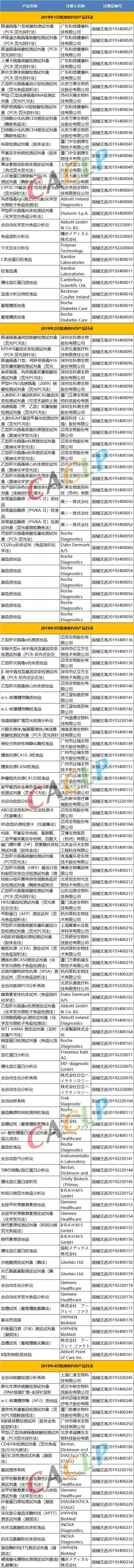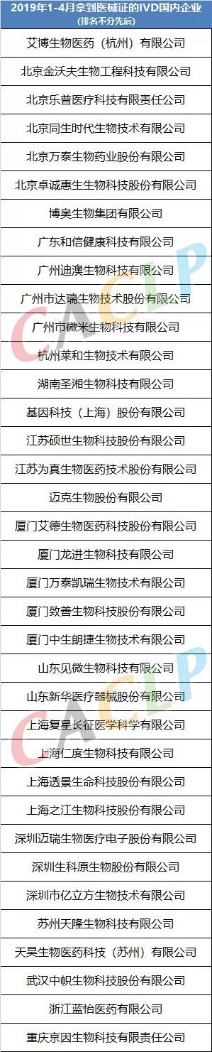根据国家药品监督管理局2019年1-4月医械产品公告显示,总计有500个医疗器械产品获批上市,其中含IVD产品131个,占比26.2%。1-4月总计36家国内IVD企业拿到了产品医械证,Caclp小编为大家整理出了企业和产品目录,请收藏。