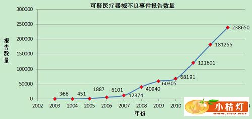 | 2014年05月07日 发布 一、全国医疗器械不良事件报告总体情况 2013年,全国医疗器械不良事件报告工作呈现良好的发展态势。报告数量持续增长,已突破23万份,平均百万人口报告数已达179份;不良事件报告的整体质量有所提升;各地对不良事件报告的重视程度明显提高。 (一)2013年可疑不良事件报告数量 2013年,国家药品不良反应监测中心共收到《可疑医疗器械不良事件报告表》238,650份,与2012年相比增长31.7%。企业后续提交《医疗器械不良事件补充报告表》705份;《医疗器械不良事件年度汇总报告表》1,805份(表1)。 表1 2013年可疑不良事件报告数量与2012年比较情况