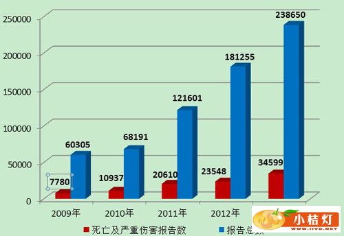 1.死亡及严重伤害事件报告数量 2013年,国家药品不良反应监测中心共收到死亡不良事件报告75份,严重伤害事件报告34,524份,共计34,599份,占可疑不良事件报告总数的百分比为14.5%,比2012年的23,548份增长了46.9%。(图1)。 ![]() 图1 2012-2013年全国死亡及严重伤害事件报告数比较 2013年,国家药品不良反应监测中心共收到医疗器械不良事件补充报告705份,年度增长率11.2%,相对于死亡及严重伤害事件报告的快速增长,承载更多信息的补充报告数量增长缓慢,说明生产企业作为报告主体的主动性不够。各级监测机构对生产企业的督促还需加强,在监管同时加大技术指导力度,帮助企业做好监测和报告工作。(图2)。 ![]() 图2 2009-2013年全国医疗器械不良事件补充报告数量 按照《医疗器械不良事件监测和再评价管理办法(试行)》的要求,第二、三类医疗器械生产企业应当在每年1月底前对上一年度医疗器械不良事件监测情况进行汇总分析,并填写《医疗器械不良事件年度汇总报告表》,报所在地省、自治区、直辖市医疗器械不良事件监测技术机构。 2013年,国家药品不良反应监测中心共收到医疗器械不良事件年度汇总报告1,805份,仅占全国现有的二、三类医疗器械生产企业数量(二类8,255家,三类2,513家)的16.8%。 4.每百万人口平均报告数量 2013年,我国每百万人口平均可疑医疗器械不良事件报告数为179份,已经达到并超过《国家药品安全“十二五”规划》中100份/百万人的要求,但各省间发展不平衡,还有1/3的省份百万人口报告数偏低。2013年百万人口平均报告数与2012年相比增长了30.7%,与2011年相比增长了94.6%。较之报告总数的增长,百万人口报告数可更好地反映报告数量的增长情况(图3)。 ![]() 图3 2010-2013年全国百万人口报告数量比较 截止到2013年12月31日,在全国医疗器械不良事件监测系统中,注册基层用户(包括生产企业、经营企业和使用单位)共148,585家。其中,医疗器械生产企业8,495家,约占注册基层用户总数的5.7%;经营企业61,498家,约占注册基层用户的41.4%;使用单位78,592家,约占注册基层用户的52.9%(图4)。 ![]() 图4 2013年全国医疗器械不良事件监测系统基层用户注册情况 表2 基层用户上报报告情况