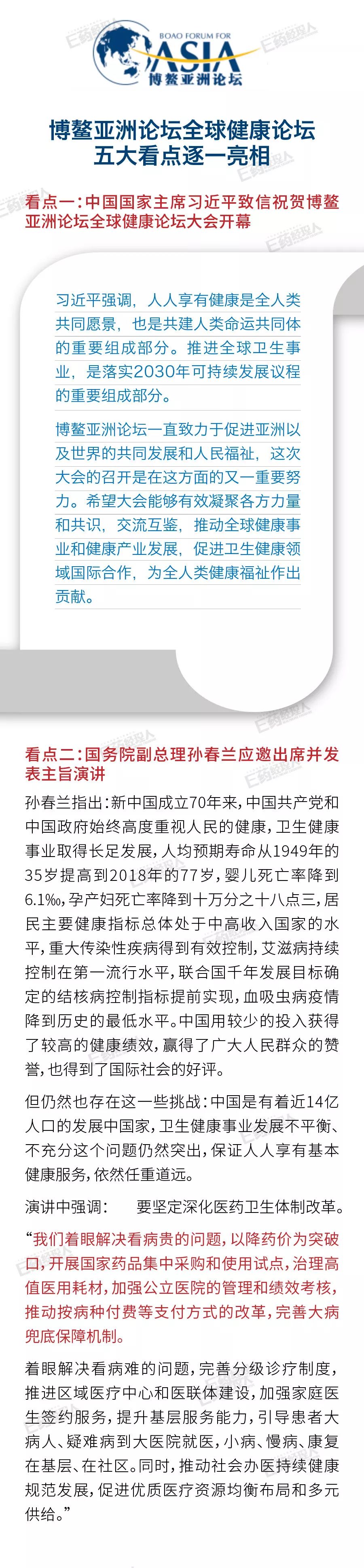 博鳌亚洲论坛全球健康论坛于2018年7月18日在北京正式成立,旨在通过协调公共政策,促进产业发展,应对人类健康挑战,增强国际卫生合作中的亚洲声音。论坛首届大会于2019年6月10日至12日在山东省青岛市举行。