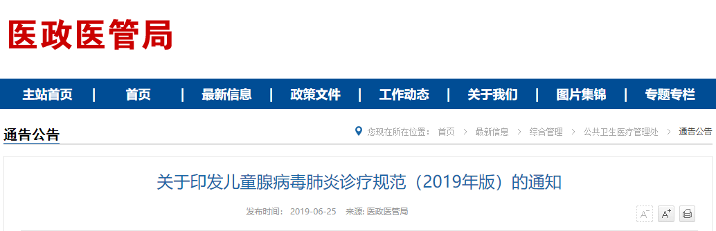 国卫办医函〔2019〕582号 各省、自治区、直辖市及新疆生产建设兵团卫生健康委、中医药管理局: 2019年以来,全国部分地区儿童腺病毒肺炎病例与往年相比有不同程度增加。为进一步加强医疗救治和临床管理,提高重症病例救治能力和规范化诊疗水平,国家卫生健康委会同国家中医药管理局组织制定了《儿童腺病毒肺炎诊疗规范(2019年版)》(可在国家卫生健康委官方网站“医政医管”栏目和国家中医药管理局官方网站下载)。现印发给你们,请结合临床诊疗实际参照执行。 联系人:医政医管局 魏涛、黄欣 联系电话:010-68792094、68792428