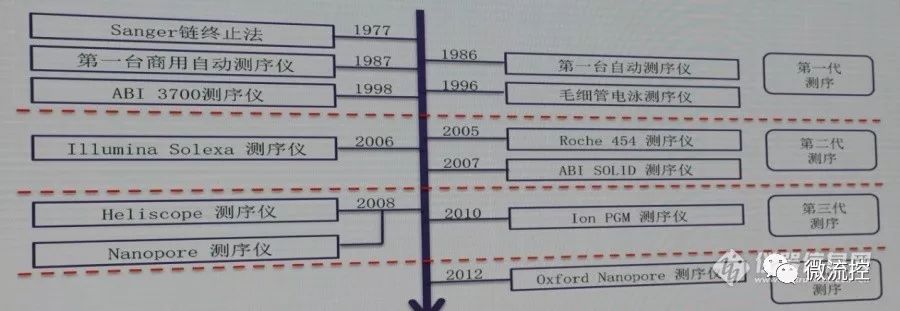 接下来是PCR仪器的发展。早期的PCR仪器,是简单的DNA解链、复制、复性等过程,除了水浴锅自动化,并没有太多技术含量。数字PCR技术出现后, 与生物信息学和微型加工技术关联起来,发展速度很快。再后来出现了微流控技术和基因测序技术。基因测序技术经历了一代、二代、三代,目前测序技术,仍然是重要的发展方向。