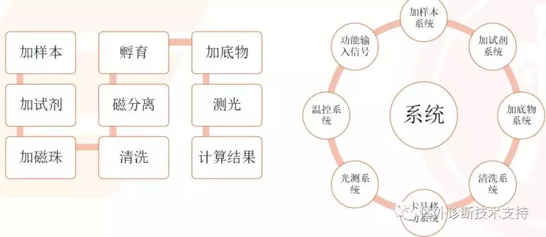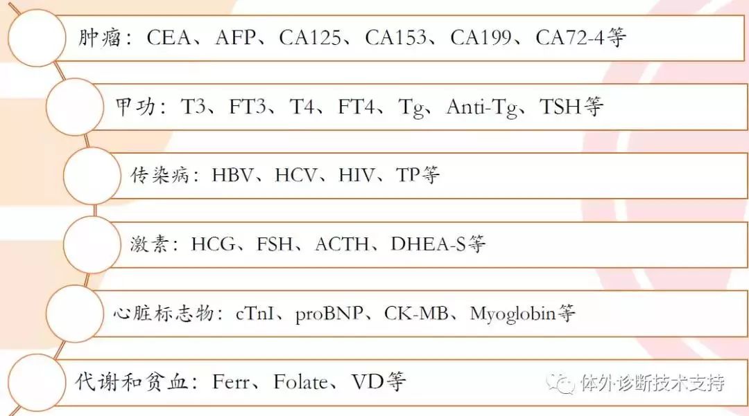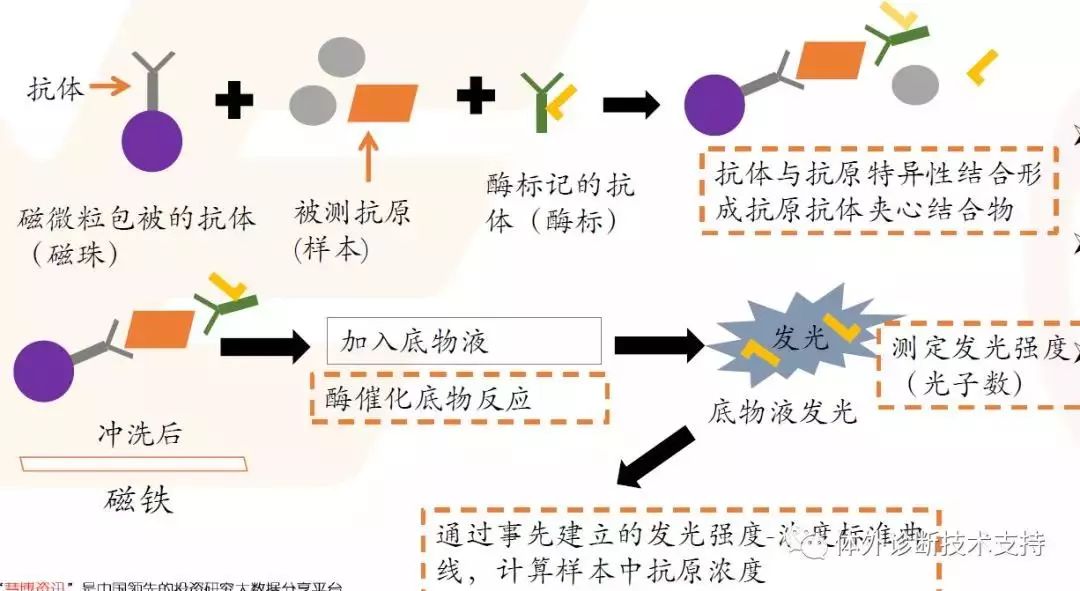 一、化学发光是干什么的? 化学发光广泛应用于临床 化学发光是免疫诊断的一种,是利用抗原抗体之间的特异性反应来测定体内疾病标志物浓度,从而判断人体身体状态的诊断方法,广泛应用于传染病、心脏疾病、肿瘤、妊娠检测等。 免疫检测标志物超过100个 免疫检测标志物统计超过100个,按照免疫反应中的角色,标志物可以分为抗体与抗原,其中抗原又包括大分子抗原与小分子抗原。 二、化学发光的原理 1、免疫反应 抗原进入机体,刺激机体的免疫系统,使之产生免疫应答,这种反应叫免疫反应。免疫反应应答包括对抗原物质的感应、反应、效应三个连续的阶段。 2、免疫分析(immunoassay,IA) 在临床检验中,基于抗原与其配对抗体能够发生特异反应,用已知的抗原或抗体检测分析体液中的抗体或抗原性物质。 3、高特异性 抗原抗体的结合实质上只发生在抗原的抗原决定簇与抗体的抗原结合位点之间。由于两者在化学结构和空间构型上呈互补关系,所以抗原抗体反应具有高度的特异性。抗原抗体反应的高特异性是免疫学检测的基础。 4、高亲和性 抗原与抗体结合形成抗原抗体复合物的过程是一种动态平衡,其反应式为:Ag+Ab→Ag·Ab。高亲和力抗体的抗原结合点与抗原的决定簇在空间构型上非常适合,两者结合牢固,不易解离。 三、免疫分析技术的发展: 美国临床化学会议规定:凡是通过测量光子计数的方法都是化学发光。 与酶联免疫相比化学发光的进步点: 1.全程自动化——机械与自动化; 2.定量技术的优化:利用化学发光发光,精确计算光子数——光学; 3.磁性颗粒的应用——材料; 4.抗体标记技术的进步——生物化学。 四、免疫诊断五大方法对比:化学发光是趋势 与其他免疫诊断方法相比,化学发光由于其在安全性、自动化操作、测试准确性、以及测试速度等方面的系统性优势,在性能上对其他技术形成全面超越,因此成为免疫诊断的主流。 化学发光步骤繁多 化学发光原理解析:以酶促法(一步法)为例 根据冲洗次数,可以分为一步法、两步法、三步法等、四步法; 各个组分的量在5~200uL级别; 所有过程均需要在特定温度中进行; 样本中与被检测检测抗原/抗体结构类似的物质会对结果产生较大影响; 五、化学发光产品开发流程多 化学发光试剂盒产品开发流程: 1、建平台
