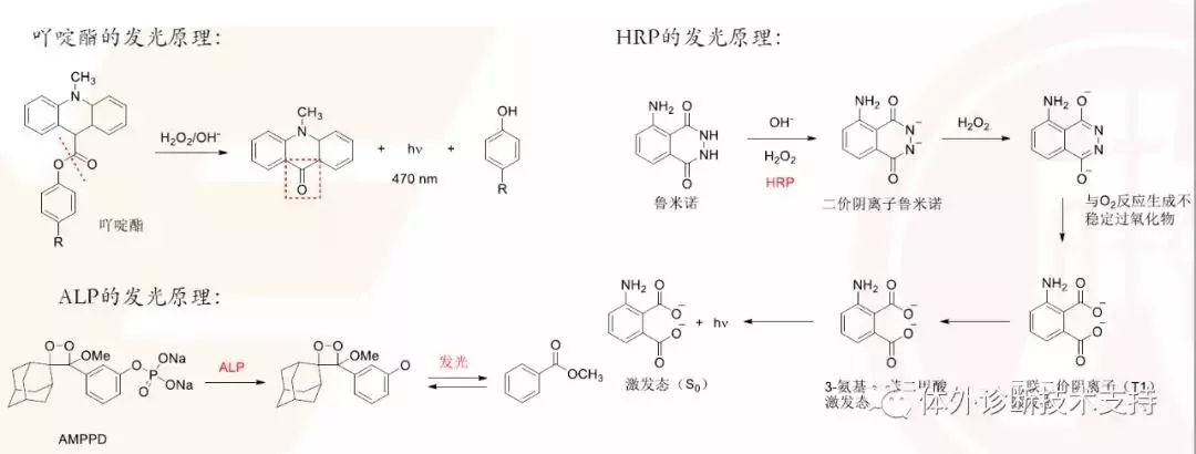 七、主流的化学发光技术各有千秋 化学发光基本原理 化学发光:由于化学反应(通常是氧化)底物从基态跃迁为激发态,激发态返回基态时,跃迁能量以光子形式释放的现象。 吖啶酯、ALP以及HRP发光系统的原理 电化学发光原理 各个系统优劣势比较 主流的5大发光技术各有优缺点