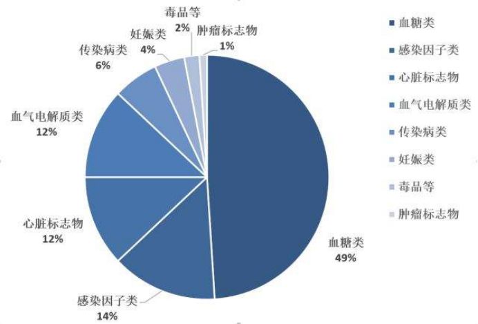 从检测项目来分,主要集中在血糖、妊娠、感染因子、心脏标志物、血气电解质、传染病检测、毒品检测、肿瘤标志物八个领域。