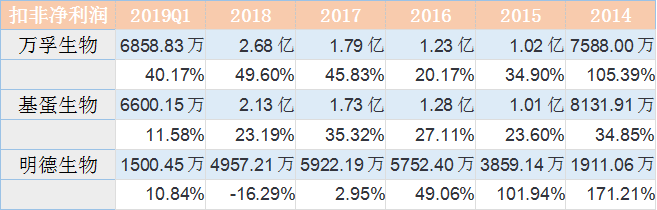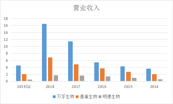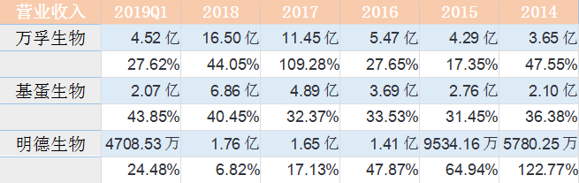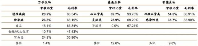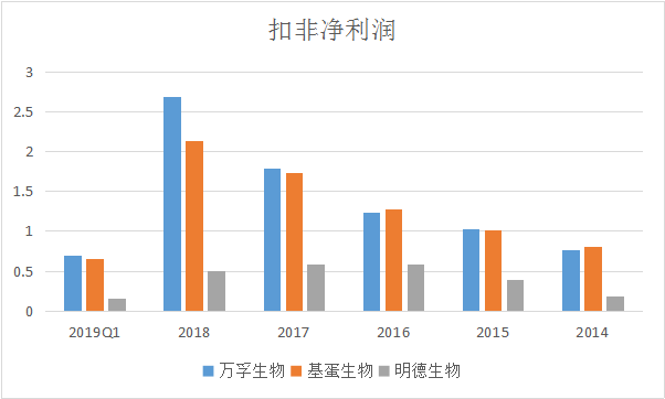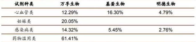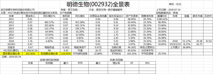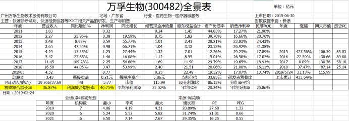 单纯从营收规模上来看,万孚生物近几年已经将差距逐渐拉开,远远领先于基蛋生物和明德生物。 但是结合扣非净利润就能看出,万孚生物近几年扣非净利润的增速是低于其营业收入增速的,而且在2016年扣非净利润甚至略微低于基蛋生物。 主营业务方面,基蛋生物以定量检测为主,心血管类检测产品比重高达62.7%,且推出多种三联检测试剂盒致使毛利率高达93.76%,整体毛利率居于较高水平; 明德生物以心脑血管及感染类疾病为主,其中在感染类检测试剂领域具有先发优势,话语权较强,毛利率显著高于基蛋生物; 万孚生物为定性兼定量检测,毛利率稍低的毒品、妊娠类业务以及贸易类业务占据公司超50%的份额,慢性病检测和传染病检测比重相较于基蛋和明德稍低,因此万孚生物整体毛利率较低。 三家企业在心血管检测业务方面都有较大比重,其中万孚、基蛋、明德分别占据国内心血管POCT检测市场的12.29%、16.30%和4.79%,随着公司产品技术的不断迭代,进口替代下市场增量空间较大;妊娠类和毒品检测类POCT以定性检测为主,门槛低,性价比突出的国内企业竞争优势明显;感染类检测产品市场空间大,但我国正处于导入期,未来国产产品有望进一步放量。 写在最后 基蛋生物的股东今年5月份进行了一波送转股份 而明德生物将于2019年7月10日有限售解禁股。 另外万孚生物拥有行业唯一的国家级实验室——自检型快速诊断国家地方联合工程实验室。工程实验室是发改委把这个行业最优秀的企业拿出来,把它作为一个国家级的示范基地,引领上下游的相关企业和相关行业的发展,这就是发改委要做工程中心和工程实验室本质的出发点和宗旨。这种工程实验室在一个领域里面只给一个单位,包括公司、大学和研究机构,所以公司能够独立拿到国家在快速诊断这块国家级的工程实验室,也表明公司在这块的研发力量、团队建设方面已经是处于国家前列。同时,还承担了不少国家级科技部的863项目,国家科技部的“十三五”规划的发展项目,就是新型POCT产品仪器与试剂系统的研发。 |