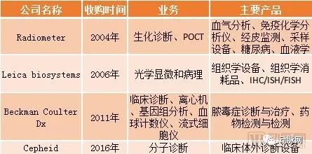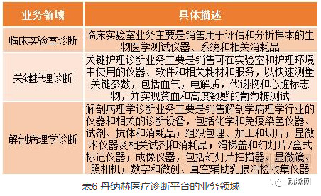GE BioPharma是GE Life Sciences的生物制药业务,主要专注于支持生物医药行业的药物发现和研发,以及生物制药的制造工艺和流程开发。其业务主要包括销售色谱所需的硬件及其耗材、细胞培养基和一次性用品,并对仪器及其耗材进行研发,以及提供相关的服务。 Illustra单细胞GenomiPhi 2018年,GE生物制药业务预计营收约为30亿美元。并购完成后,GEBioPharma将作为一家独立运营的公司。 医疗诊断平台 丹纳赫的医疗诊断平台提供医院、医生办公室、参考实验室和其他关键护理机构的分析仪器、试剂、耗材、软件和服务。丹纳赫qixia的医疗诊断平台目前包含4家公司,它们分别是Radiometer、Leica biosystems、Beckman Coulter Sx、Cepheid。 在丹纳赫医疗诊断的整个并购史上,买进来的公司或者部门不止这四家,那些被买进来的公司根据业务的重叠性,已经被并入上述4家公司里面了。 表5 丹纳赫医疗诊断平台的4家子公司 这4家公司共同构成了丹纳赫的医疗诊断平台,增长迅速,2018年毛利润率大于25%。 根据丹纳赫2018年的财报,2013年,整个医疗诊断平台的营收仅44亿美元,年增长率约为4%。2018年,平台的营收达到62亿美元,年增长率约为6%。 按照销售收入的贡献区域划分,38%的销售收入来自北美市场,19%的销售收入来自欧洲市场,37%的销售收入来自高增长市场(包含中国),6%的销售收入来自其他地区的市场。 图4 丹纳赫医疗诊断平台的销售收入分布区域 医疗诊断平台业务覆盖领域 表6 丹纳赫医疗诊断平台的业务领域 丹纳赫医疗诊断平台4家公司的拳头产品和2018财年表现如下: