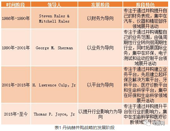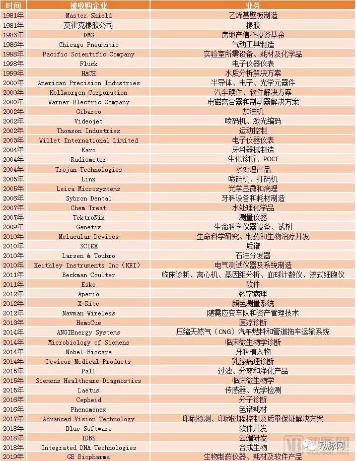 “迅速流动的溪流”,这是丹纳赫(Danaher)名字的起源,Danaher是一条位于美国蒙大拿州西部的河流。Dana源自于古老的凯尔特语,含义是“迅速流动”,这也是对丹纳赫几十年来快速创新的恰当描述。 从一家成立于1969年名不见经传的房地产信托投资基金,到今天的全球医疗器械巨头,丹纳赫在过去50年间,身段灵活、脚步急速,灵活地根据不同发展阶段选择适合自己的发展战略,并实现快速发展。 在此,动脉网梳理了丹纳赫的并购史,试图通过分析丹纳赫的并购战略,展现医疗器械巨头的成长之路。 概览:丹纳赫的并购史 1969年,丹纳赫的前身DMG房地产信托投资基金成立,1986年,公司改名丹纳赫,通过并购一步步实现了战略转型。丹纳赫的并购战略可以划分为四个阶段:以财务为导向、以业务为导向、以平台为导向和以提升行业影响力为导向。 表1 丹纳赫并购战略的发展阶段 我们需要特别提及,在第三阶段的2004年,丹纳赫通过收购Radiometer进入了医疗诊断领域。2005年,丹纳赫收购Leica Microsystems进入生命科学领域。通过这两次收购,丹纳赫建立起了自己的医疗诊断平台和生命科学平台,准备好了日后高速增长的动力引擎,并围绕这两个版块进行了一系列动作。 2015年,丹纳赫以138亿美元的价格收购了Pall,增强了生命科学平台的实力。2016年,丹纳赫进行了自成立以后最大规模的公司拆分,建立了新的公司Fortive,将专业仪器仪表和工业技术两个部门拆分出去。此次的公司拆分,让丹纳赫能够更加专注于提升现有的环保及应用解决方案、牙科、医疗诊断和生命科学平台的实力。 2018年7月,丹纳赫宣布继续进行公司拆分,成立独立的公司Dentalco,把牙科平台拆分出去。此后,丹纳赫更加专注于自身环保及应用解决方案、医疗诊断和生命科学平台的发展。 2019年,丹纳赫宣布以214亿美元作价收购GE Biopharma,作为丹纳赫史上规模最大的并购业务,此次收购将进一步提升其生命科学平台的行业影响力。 此时的丹纳赫,早已远离了房地产信托投资基金的起点。它建立起了自己的三大平台,即环保及应用解决方案平台、医疗诊断平台和生命科学平台。目前,丹纳赫正不断通过并购和公司拆分提升平台实力,成长为医疗器械领域最强王者。 图1 丹纳赫2018年的公司架构 表2 丹纳赫的并购时间线(动脉网根据方正证券研究报告和crunchbase相关信息整理) 图2 丹纳赫的并购动作与营业收入的联系 12家公司与生命科学联盟 建立生命科学平台和医疗诊断平台,是丹纳赫发展历程中的关键节点。这两个平台也是目前丹纳赫营收占比最大的两个平台。 生命科学平台 根据丹纳赫2018年的财报,2018年,生命科学平台在全球的营收约为65亿美元,是丹纳赫qixia营收占比最大的平台。并购GE Biopharma后,全年营收可能会达到95亿美元,这将促使生命科学平台大幅超过医疗诊断平台的营收,成为丹纳赫最重要的业务平台。 生命科学平台qixia有8家公司,分别是Leica Microsystems、Molecular Devices、AB SCIEX、Beckman Coulter Life Science、Pall、Phenomenex、Integrated DNA Technologies和GE Biopharma。 表3 丹纳赫生命科学平台的8家子公司 这8家公司共同构成了丹纳赫的生命科学平台,成长迅猛,2018年毛利润率大于25%。 根据丹纳赫2018年的财报,2013年,整个生命科学平台的营收仅24亿美元,可重复收入占比35%。2018年,生命科学平台的营收达到65亿美元,可重复收入占比65%。 按照销售收入的贡献区域划分:35%的销售收入来自北美市场,29%的销售收入来自欧洲市场,27%的销售收入来自高增长市场(包括中国),9%的销售收入来自其他地区的市场。 图3 丹纳赫生命科学平台的销售收入分布区域 生命科学平台业务覆盖领域 表4 丹纳赫生命科学平台的业务领域 丹纳赫生命科学平台8家公司的拳头产品和2018财年表现如下: