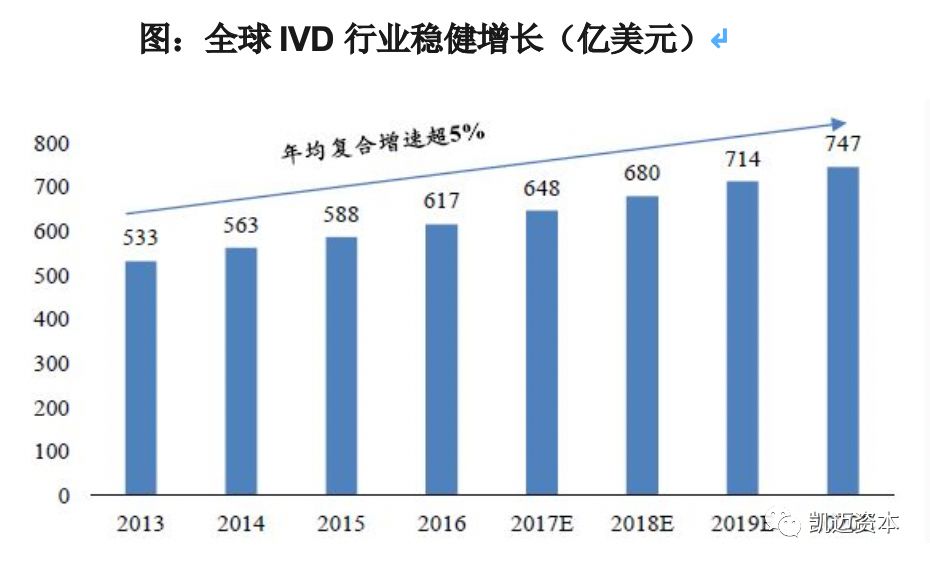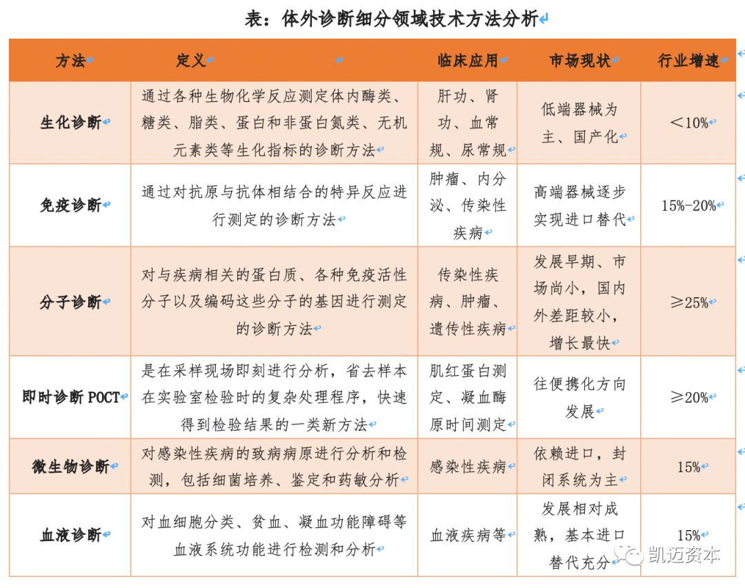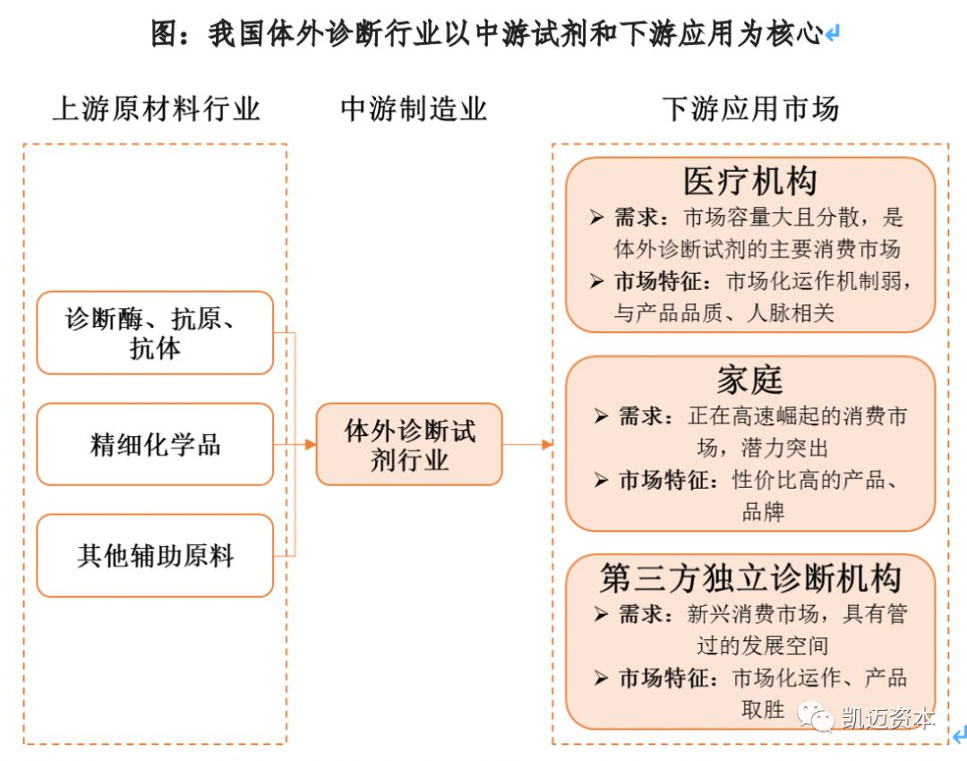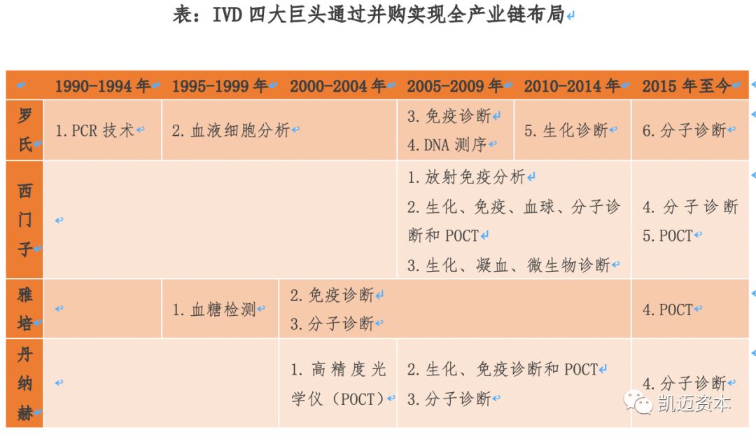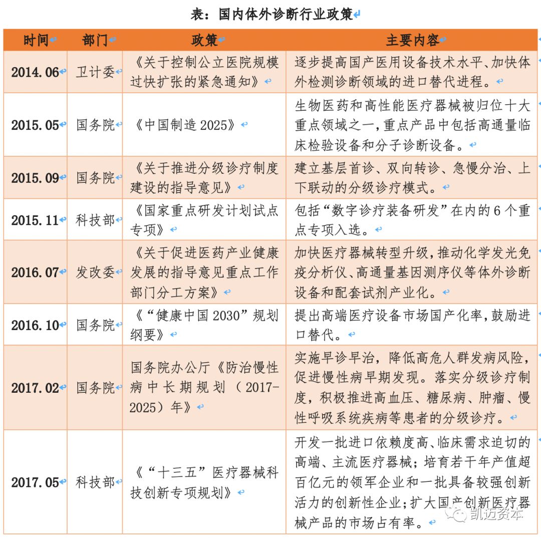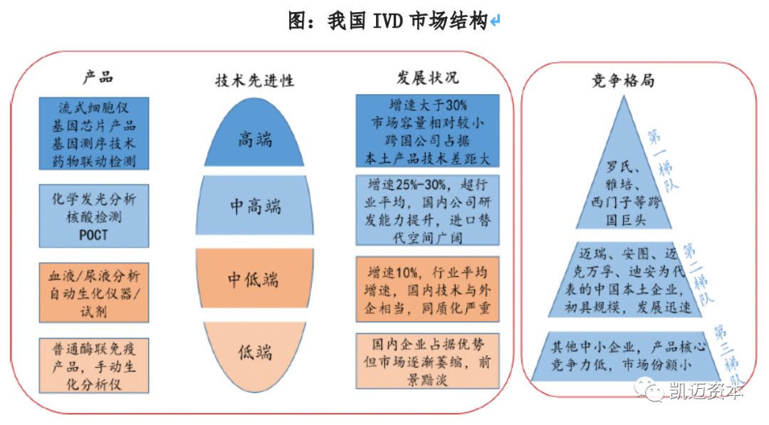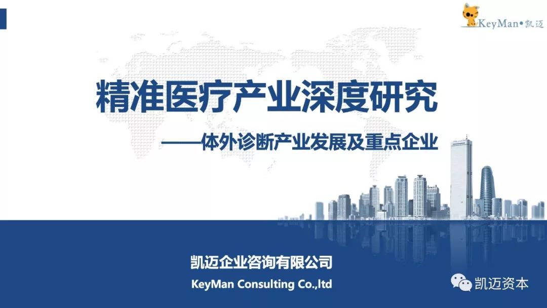 「凯迈咨询项目团队除了对国内精准医疗产业园区进行实地走访调研之外,还结合国内外精准医疗产业发展现状,进行了深度研究,形成了精准医疗产业深度研究报告,为国内各地、各开发区进行精准医疗产业发展在产业层提供了支持。凯迈研究院将持续为您带来精准医疗产业深度研究报告。」 精准医疗系列报告 【概述及分类】 体外诊断( IVD,In-Vitro Diagnostics )是指将血液、体液、组织等样本从人体中取出,使用体外检测试剂、试剂盒、校准物、质控物等对样本进行检测与校验,以便对疾病进行预防、诊断、治疗检测、后期观察、健康评价、遗传疾病预测等的过程。 按检测方法或原理划分,我国体外诊断试剂包括生化诊断、免疫诊断、分子诊断、POCT(即时诊断)、凝血类诊断和血液学等类别。 生化诊断产品在我国发展较早,为医院常规诊断检测项目,未来增长速度较慢,试剂基本上已全部实现国产化,大部分仪器也已国产化,仅在仪器检测速度和一体化上与国外仪器有差距。 免疫诊断是我国细分规模最大的体外诊断子行业并仍处于快速发展之中,中低端试剂和仪器均取得了较好的国产化成果,但在三级医院的高端市场,整体仍旧被海外巨头垄断,未来高端免疫诊断市场的进口替代是发展方向。 分子诊断在全球范围内都处于发展的初期,也是我国与海外在技术上差异较小的领域,未来将保持快速增长。 POCT在我国则刚刚起步,未来便捷化亦是大势所趋。 【法规政策】 2011年开始我国即密集出台了一系列的支持体外诊断行业发展的产业政策,尤其支持国产化的试剂和仪器来实现进口替代。我国体外诊断行业以产业链核心的中游诊断试剂和仪器为主,目前试剂的国产化进程快于仪器。生化、免疫、分子等各个诊断领域的试剂均在一定程度上实现了国产化,仅在部分高端领域国产化率还较低。但仪器来看仅部分中低端的生化、免疫和分子诊断的仪器实现了国产化,高端的仪器大多都依赖进口,整体国产化率还很低。鼓励进口替代、医保控费、分级诊疗等政策的落实都将支持国内体外诊断企业的发展。近年来我国体外诊断行业保持了持续快速的增长。未来随着国内庞大的潜在市场需求的释放,行业将继续保持快速发展,叠加产业政策助力国产化和国内企业的技术突破,未来我国体外诊断企业将迎来发展的黄金期。 小结:叠加产业政策助力国产仪器、试剂进口替代 目前全球体外诊断需求市场主要分布在北美、欧洲、日本等发达经济体国家,欧美日共占据全球体外诊断行业70%以上的市场份额,需求相对稳定,增长缓慢; 中国、印度等新兴经济体国家全球市场份额占比较低,但由于人口基数大、经济增速高,近几年医疗保障投入和人均医疗消费支出持续增长,体外诊断行业正处于快速增长期。其中拉美的增速最快,2011-2016年行业复合增速达到了24%,其次是中国,复合增速17%,再次是印度同样达到了14%,并呈现以下特点: (1)行业集中度高,四大巨头占据全球半壁江山 海外体外诊断行业经过多年的发展,行业不断并购整合,市场集中度逐步上升。罗氏、雅培、西门子、丹纳赫在2015年共占据全球体外诊断市场超过50%的市场份额,垄断优势明显。主要是因为体外诊断主要的市场在北美和西欧,因此前四大巨头也都是北美和西欧的企业。未来随着新兴市场体外诊断需求的增长和当地厂商的崛起,未来全球IVD行业的集中度将有所下降。 (2)罗氏、西门子诊疗并重,雅培趋多元化,丹纳赫则热衷并购。 罗氏制药与诊断双轮驱动,是全球制药和诊断领域的领导者,也是全球最大生物技术公司,连续8年被被道琼斯可持续发展指数评为最具可持续发展的医疗公司。2017年凭借121亿瑞郎(127亿美元)的体外诊断销售额,稳居全球体外诊断行业第一位。 雅培是一家全球性、多元化医疗保健公司,经营始终围绕医疗保健进行,产品包括营养产品、诊断产品、糖尿病护理、心血管产品、药品等,2017财年雅培通过收购全球最大的POCT生产商美尔利尔,其诊断销售额跃升至56.2亿美元,全球IVD市场排名第二。 丹纳赫是一家热衷并购的企业,起家于财务投资公司,后经过一系列大规模并购活动,成长为工业机械和电子仪器巨头,2011年贝克曼被Danaher丹纳赫集团整体收购,2017年贝克曼所属丹纳赫体外诊断业务的销售额约为58.4亿美元,其中贝克曼的营收占大部分,在全球IVD领域排名第三。 西门子是全球领先的技术公司,也是诊断成像和实验室诊断领域的领导者,其提供医疗技术和软件解决方案以及临床咨询服务,并提供一整套培训和服务,全面的产品组合为客户提供持续的护理服务,从预防和早期发现到诊断、治疗和后续护理。西门子医疗2016财年IVD业务销售额约49亿美元,全球IVD市场排名第四。 (3)国内借鉴:小时修炼内功,大了外延扩张 体外诊断行业是由上游原材料、中游体外诊断试剂和仪器、下游需求共同组成。上游的关键原材料主要包括酶、抗原、抗体等;下游的消费需求主要来 自医疗检测和血液筛查,医疗检测是体外诊断产品最主要的消费方向,包括医院、体检中心、独立实验室、疾病预防控制中心等,而血液筛查主要是采供血部门对于血液的检测,包括各类血站和血制品厂家。 (1)透景生命:高举高打,高端市场直接进口替代 公司的核心竞争力在于其国内独家的高通量流式荧光技术,该技术与传统主流的化学发光技术相