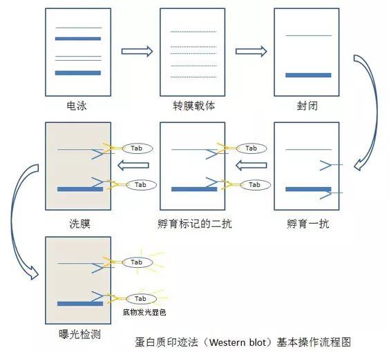 免疫印迹(Western Blot,WB)采用聚丙烯酰胺凝胶电泳(SDS-PAGE)对样品中的蛋白质按照分子量进行分离,转移到固相载体(例如硝酸纤维素薄膜,NC)上。固相载体可以吸附蛋白质,并保持电泳分离的多肽类型及其生物学活性不变。转移后的NC膜就称为一个印迹(blot),用蛋白溶液(如BSA或脱脂奶粉溶液)封闭处理,封闭NC膜上的非特异结合位点。用目标蛋白的抗体(一抗)孵育NC膜,只有待研究的蛋白质才能与一抗特异结合形成抗原抗体复合物,这样清洗除去未结合的一抗后,只有在目标蛋白上结合一抗。用一抗处理过的NC膜再用标记的二抗孵育,带有标记的二抗与一抗结合形成抗体复合物可以指示一抗的位置,即是待研究的蛋白质的位置,并根据显色或发光的强度进行定量。