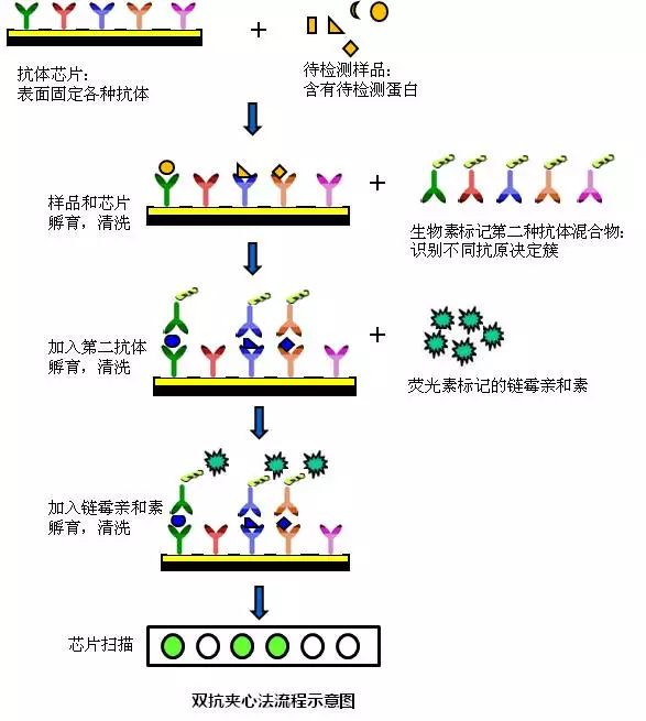 蛋白芯片属于微阵列芯片的一种。蛋白芯片技术的基本原理是将各种蛋白质有序地固定于滴定板、滤膜和载玻片等各种载体上成为检测用的芯片。然后,用标记了特定荧光抗菌素体的蛋白质或其他成分与芯片作用,经漂洗将未能与芯片上的蛋白质互补结合的成分洗去,再利用荧光扫描仪或激光共聚焦扫描技术,测定芯片上各点的荧光强度,通过荧光强度分析蛋白质与蛋白质之间相互作用的关系,由此达到测定各种蛋白质功能的目的。