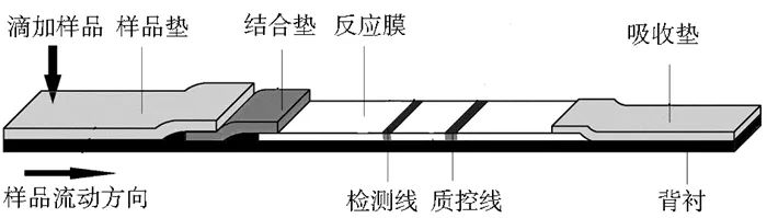 试纸条技术,即免疫层析法,其原理是将特异的抗体先固定于硝酸纤维素膜的某一区带,当该干燥的硝酸纤维素一端浸入样品(尿液或血清)后,由于毛细管作用,样品将沿着该膜向前移动,当移动至固定有抗体的区域时,样品中相应的抗原即与该抗体发生特异性结合,若用免疫胶体金或免疫酶染色可使该区域显示一定的颜色,从而实现特异性的免疫诊断。目前试纸条的标记物形式多样,有胶体金、乳胶颗粒、量子点、荧光物质、上转换颗粒和酶等。