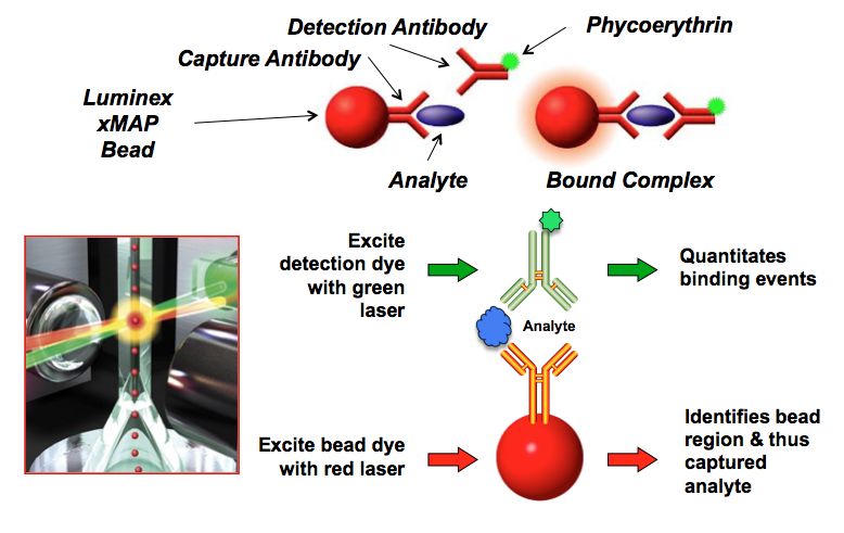 从免疫诊断看其技术原理,该技术最关键的是以Luminex xMAP荧光编码微球为核心,结合免疫学原理进行抗原抗体反应,通过标记其它荧光分子如藻红蛋白等,运用激光进行荧光信号分析、实现多指标并行检测。因此其技术本身就具有高通量、并行检测的特点。
