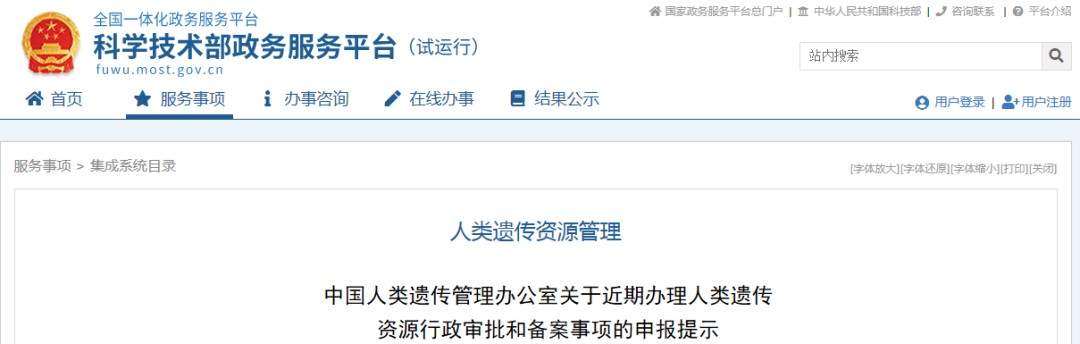 中国人类遗传资源管理办公室 2019年8月22日 来源:科学技术部政务服务平台 官网 2019年08月22日 科学技术部重要遗传家系和特定地区人类遗传资源 申报登记办法(暂行) (2019年7月1日) 第一条为掌握我国重要遗传家系和特定地区人类遗传资源分布,加强我国重要遗传家系和特定地区人类遗传资源的保护,规范重要遗传家系和特定地区人类遗传资源的申报登记活动,根据《中华人民共和国人类遗传资源管理条例》,制定本办法。 第二条本办法所称重要遗传家系是指患有遗传性疾病或具有遗传性特殊体质或生理特征的有血缘关系的群体,患病家系或具有遗传性特殊体质或生理特征成员五人以上,涉及三代。 特定地区人类遗传资源指在隔离或特殊环境下长期生活,并具有特殊体质特征或在生理特征方面有适应性性状发生的人群遗传资源。特定地区不以是否为少数民族聚居区为划分依据。 第三条单位或个人发现重要遗传家系和特定地区人类遗传资源的,按照本办法向科学技术部进行申报登记。 第四条向科技部申报登记重要遗传家系和特定地区人类遗传资源,应当登录人类遗传资源申报登记系统,如实填写《重要遗传家系和特定地区人类遗传资源申报登记表》,视情况提供下列信息: (一)申报登记单位或个人基本信息; (二)重要遗传家系名称、临床表现、遗传性状及家系遗传谱图、居住地等; (三)特点地区人群地理位置、地理特征、适应性性状等。 第五条科学技术部可采用电话问询、专家咨询、现场调研等方式对重要遗传家系和特定地区人类遗传资源申报登记信息进行核实,有关单位和个人应当配合。 申报登记信息核实中发现下列情形之一的,不予登记: (一)不属于申报登记范围的; (二)重复申报登记的; (三)其他依法不予登记的。 第六条科学技术部定期组织开展全国重要遗传家系和特定地区人类遗传资源调查。调查每五年开展一次,必要时可以根据实际需要开展。 省、自治区、直辖市人民政府科学技术行政部门配合科学技术部开展本行政区域内重要遗传家系和特定地区人类遗传资源的调查工作。 第七条科学技术部建立重要遗传家系和特定地区人类遗传资源档案信息管理系统,收集、保存重要遗传家系和特定地区人类遗传资源数据和资料,进行监测和评估。 科学技术部鼓励重要遗传家系和特定地区人类遗传资源的申报登记单位或个人,合理利用相应资源开展科学研究,对相关研究项目予以适当支持。 第八条重要遗传家系和特定地区人类遗传资源申报登记过程中涉及国家秘密的,应严格按照有关保密规定执行。 第九条重要遗传家系和特定地区人类遗传资源申报登记工作不收取任何费用。 附件
