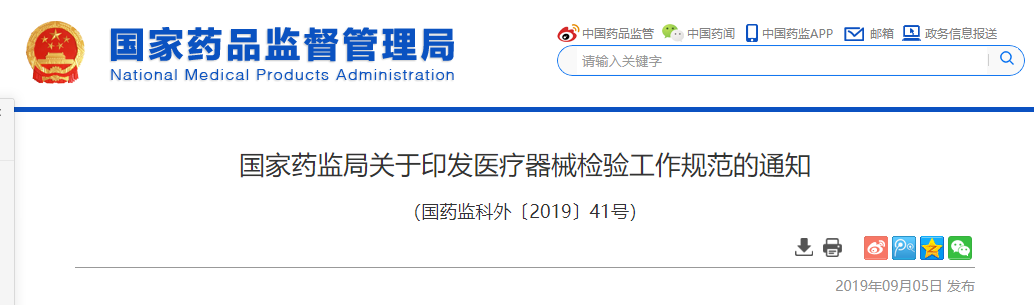 各省、自治区、直辖市药品监督管理局,新疆生产建设兵团药品监督管理局,各有关单位: 为进一步规范医疗器械检验工作,提升医疗器械检验机构的检验能力、管理水平、工作质量和效率,国家药品监督管理局组织制定了《医疗器械检验工作规范》,现予印发,请遵照执行。