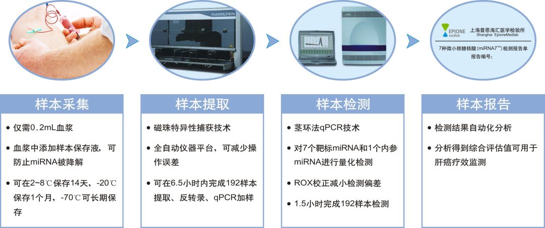 磁珠特异性捕获技术可有效将7种靶标miRNA从血浆中提取(miR-21,miR-26a,miR-27a,miR-122,miR-192,miR-223,miR-801)。茎环结构引物设计的qPCR技术可完成7种miRNA的量化检测。配合全自动化荧光PCR平台完成全部操作,确保检测正确。