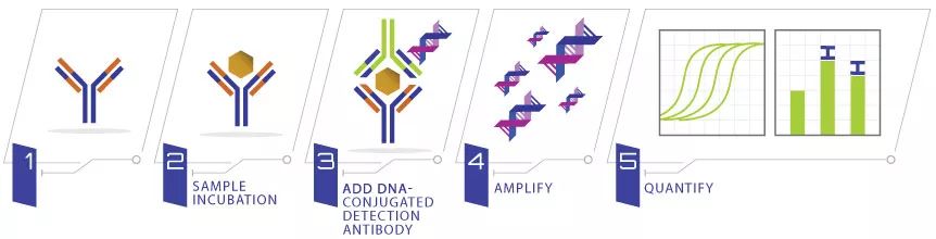IMPERACER将抗体偶联DNA作为检测试剂,通过real-time qPCR扩增来确定检测结果。和传统ELISA相比,具有以下几点优势:灵敏度高1000倍,检测范围达到五个数量级,基质背景低,需要样本量少。