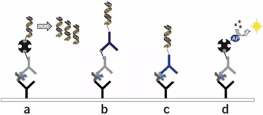 在Sano等人进行的免疫PCR中,将牛血清白蛋白(BSA)固定在微量滴定板上,然后用附着有链霉亲和素蛋白A蛋白嵌合体的单克隆抗体进行检测。然后将生物素化的线性DNA加入孔中,通过PCR扩增,并通过琼脂糖凝胶电泳分析。随后,该方法发展成为利用qPCR进行定量的超敏检测,最低可在1毫升溶液中检测几个生物标志物。