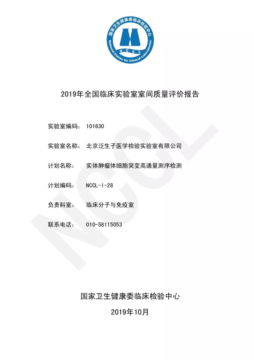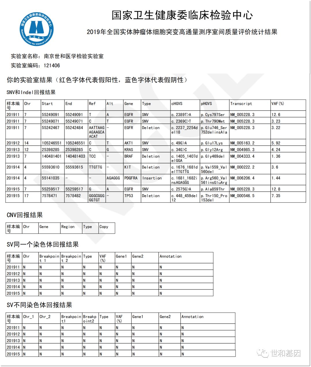 国家卫生健康委临床检验中心(NCCL, National Center for Clinical Laboratories)近日公布了《2019年全国实体肿瘤体细胞突变高通量测序检测室间质量评价》结果。全国实体肿瘤体细胞突变高通量测序检测室间质量评价计划,由国家卫生健康委临床检验中心(NCCL)组织筹划,旨在保证各临床实验室检测质量。该项室间质量评价计划可以确定参评实验室实体肿瘤体细胞突变高通量测序检测的能力,发现在检测过程中存在的问题,促进实验室提高检测水平。 本次室间质评由国家卫生健康委临床检验中心(NCCL)组织并实施。旨在保证个临床实验室检测的质量,该室间质量评价计划可以反映参评实验室实体肿瘤体细胞突变高通量测序检测的能力,促进实验室提高水平。本次能力验证我国共有来自20个省(市、自治区)的共184家实验室参加,共有165个实验室回报了结果,其中仅有90家实验室满分通过了质量检测(54.5%)。 部分满分实验室(排名不分分先后) 一、世和基因 二、求臻医学 三、泛生子医学检验四、金域医学五、北京吉因加