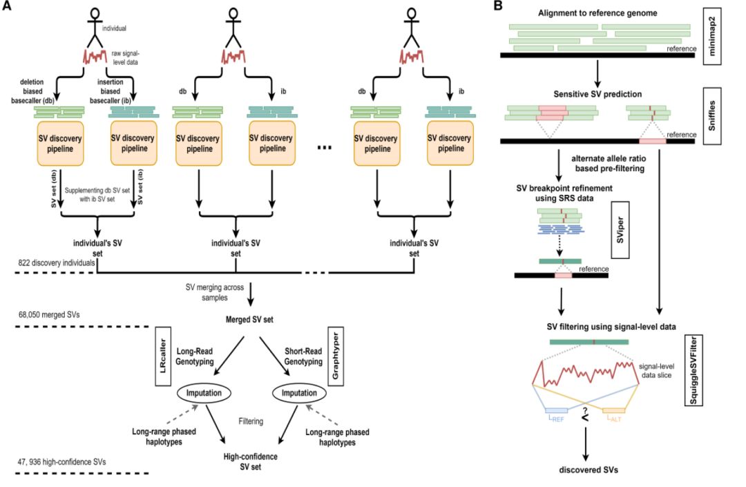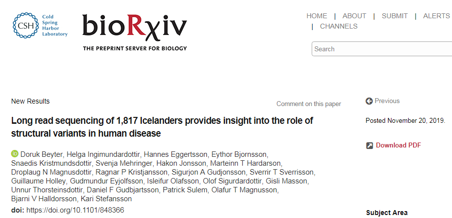 结构变异(SV)是遗传多样性的主要来源。目前,大规模遗传研究主要使用全基因组短读长测序(通常为100-200 bp)。短读长测序可以相当可靠地鉴定SNP和Indel,但在鉴定SV方面仍存在困难。相比之下,长读长测序的读取长度可达数千个碱基(kb),能够以更高的准确性检测SV,实现更好的断点解析(breakpoint resolution)和长度确定。此前,长读长测序多应用于小规模人类基因组测序和SV鉴定,尚未有大规模应用分析的报道。 近日,冰岛deCODE genetics公司领导的研究团队首次使用牛津纳米孔技术(ONT)测序进行了人群规模的测序研究。基于1,817名冰岛人长读长测序数据,研究团队在每个参与者中鉴定的常染色体SV中位数为23,111个,累计中位数为9.9 Mb,并发现了SV在人类疾病中作用的相关信息。相关研究成果的预印文章已发表在bioRxiv上。据悉,1,817名冰岛人(包括369个家系)来自deCODE Genetics公司各种研究中招募的参与者。研究团队从血液(n = 1698)和心脏组织(n = 119)中分离DNA,并使用ONT GridION和PromethION测序仪进行测序。结果显示,研究团队在每个参与者中鉴定的常染色体SV中位数为23,111个,包括11,506个插入和11,576个缺失,累计中位数为9.9 Mb。 经数据分析,稀有SV的尺寸要比普通SV大,并且更有可能影响蛋白质功能。此外,该研究还发现了与PCSK9的第一个外显子罕见缺失相关的信息,这种罕见变异携带者的低密度脂蛋白胆固醇水平比人群平均水平更低。长读长测序数据改善了SV的发现和基因分型。在47,936个高置信度SV中,研究团队从长读长测序和短读长测序基因分型中,分别推算出17,590和3,996 个SV。在每个个体中,通过长读长测序发现的变体数量随测序深度的增加而增加,但在约30x 时达到饱和。研究人员认为,或许可以通过在其他个体中发现的SV进行基因分型,来鉴定单个个体中遗漏的结构变异,因为罕见结构变异更容易被遗漏。该研究强调了长读长测序在结构变异分辨率中的作用,通过全基因组非靶向的方式,长读长测序数据可以在人群规模上准确表征SV,以及这些结构变体如何影响疾病。此外,PromethION具有与MinION和GridION相同的特点,且能够在人群规模上实现实时、长读长、直接DNA和RNA测序。deCODE Genetics研究团队表示:“我们展示了首个Oxford Nanopore Technologies测序技术在人群规模上的应用。我们对1817名冰岛人进行了测序,包括369个家系,作为deCODE genetics在各种表型研究工作中的一部分。影响蛋白质功能的SV极为少见,因此我们认为大规模的SV研究对于了解它们在疾病中的作用至关重要。”Oxford Nanopore首席执行官Gordon Sanghera评论道:“纳米孔测序为解决结构变异提供了更简单的解决方案,它能够独特地为群体测序提供信息丰富、数量充足的长读长测序数据。deCODE希望进一步了解SV在健康和疾病中作用,我们期待看到他们的下一步发展。”与SNP和indel相比,SV可改变更多的碱基对,这些变异的相对影响是一个重要的研究途径。这项发表在bioRxiv的研究结果表明,大规模的SV研究对于理解其在人类进化和疾病遗传学中的作用至关重要,并且也会促进更好的研究方法和技术的发展。该研究为进一步大规模研究SV奠定了基础,1.Long read sequencing of 1,817 Icelanders provides insight into the role of structural variants in human disease,https://www.biorxiv.org/content/10.1101/848366v12.OxfordNanopore:人群规模的纳米孔测序为结构变异(SV)在人类疾病中的作用提供新见解 |